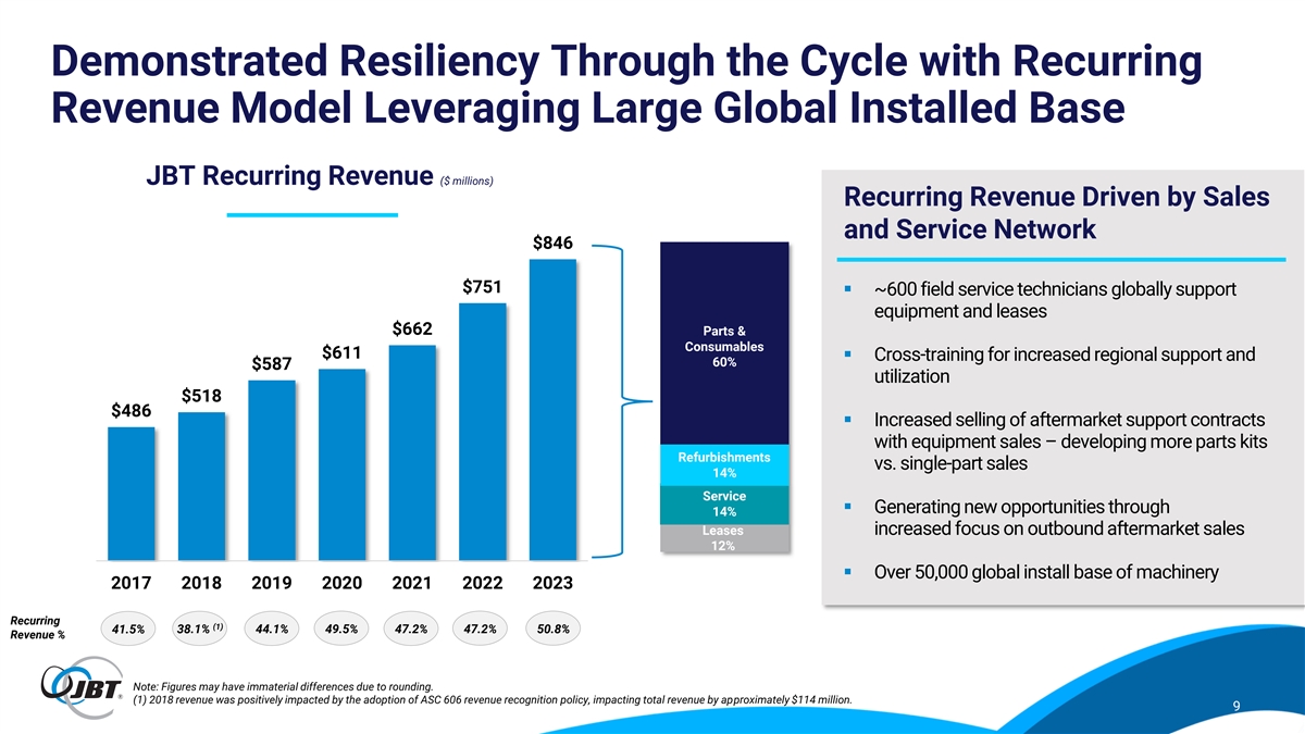More Stable and Resilient Investment by Food & Beverage Producers Supports JBT (1) Indexed Capex Comparison Benefits of Stable Demand for Food and Beverage Products More moderated growth expected in 2024 given larger capacity expansions ▪ Continued growth in food and beverage Quick capex recovery in prior years for food & beverage consumption creates a less cyclical environment producers after pandemic recession ▪ During economic recessions, capex for food and Capex was essentially flat for ~40 food & beverage producers was not as severely impacted beverage producers when compared to major industrial companies in during great recession 2007 – 2023 food & vs. significant declines Flatter investment by food the XLI for XLI companies beverage producer & beverage producers in 2016 - 2018 capex CAGR of ~4.8% ▪ JBT benefits as food and beverage producers vs. XLI of ~2.3% continue to invest in equipment solutions to serve the end consumer Source: Capital IQ. (1) XLI represents the companies in the Industrial Select Sector SPDR Fund. Global food and beverage producers represents approximately 40 top global producers. 8