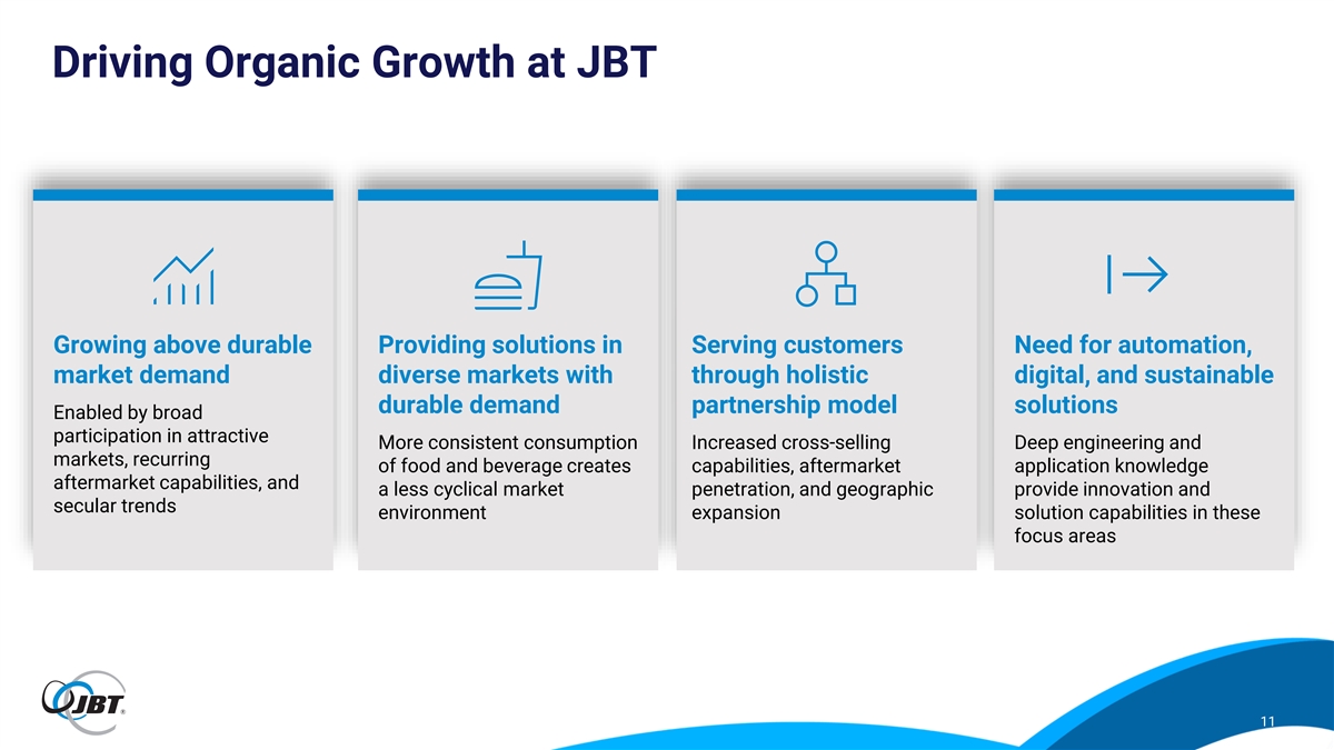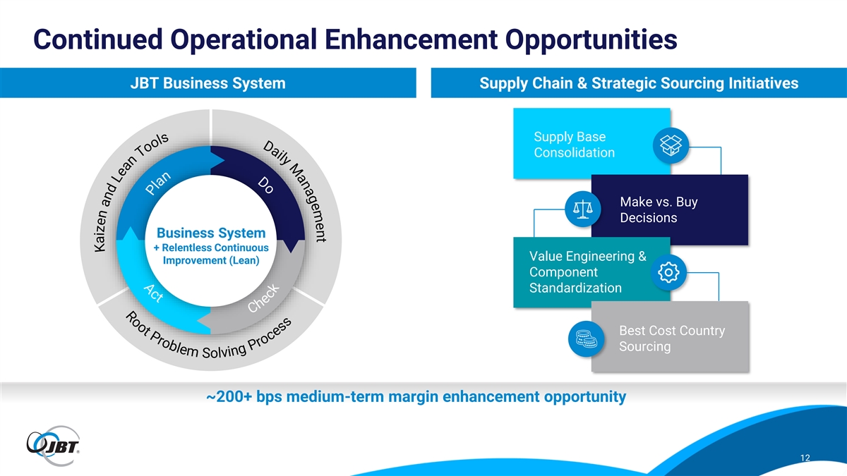 Driving Organic Growth at JBT Growing above durable Providing solutions in Serving customers Need for automation, market demand diverse markets with through holistic digital, and sustainable durable demand partnership model solutions Enabled by broad participation in attractive More consistent consumption Increased cross-selling Deep engineering and markets, recurring of food and beverage creates capabilities, aftermarket application knowledge aftermarket capabilities, and a less cyclical market penetration, and geographic provide innovation and secular trends environment expansion solution capabilities in these focus areas 11