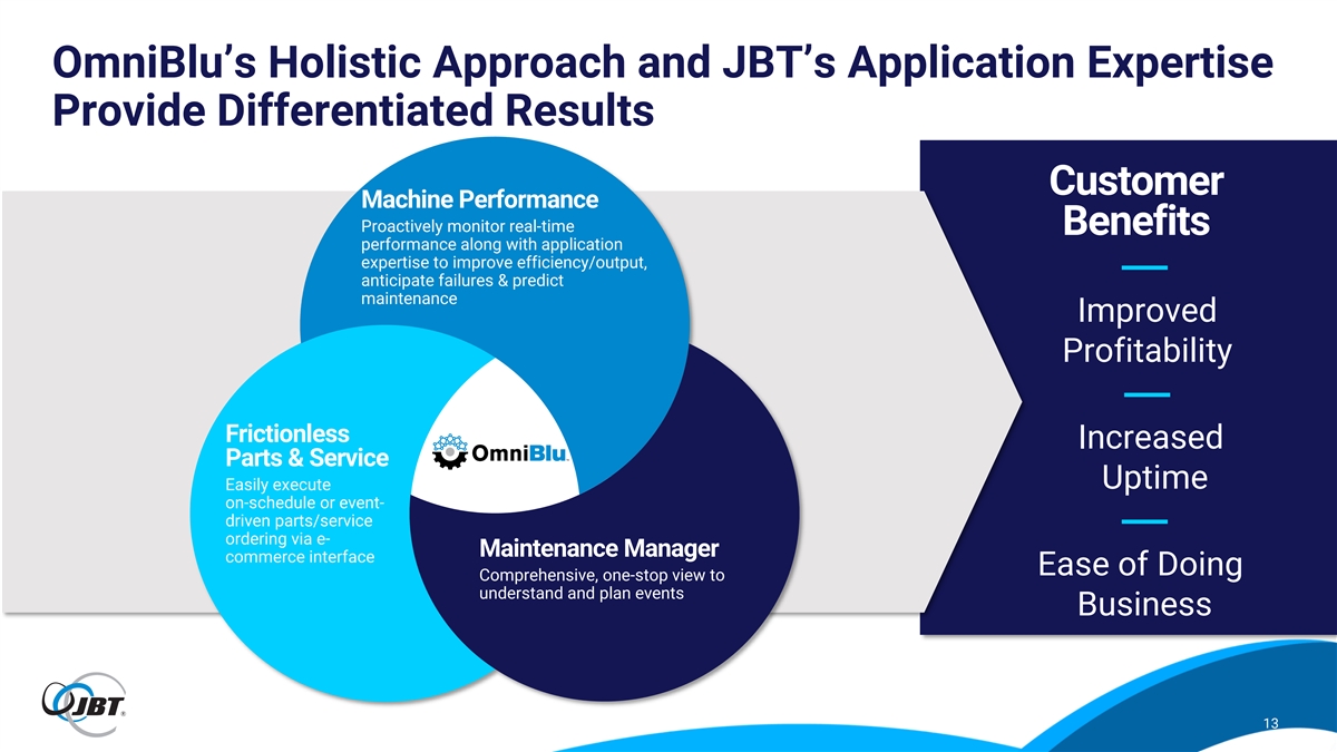 t n e m e g a n a A M R o o y c D o l i t t a P D r o b l e m S Continued Operational Enhancement Opportunities JBT Business System Supply Chain & Strategic Sourcing Initiatives Supply Base Consolidation Make vs. Buy Decisions Business System + Relentless Continuous Value Engineering & Improvement (Lean) Component Standardization Best Cost Country Sourcing ~200+ bps medium-term margin enhancement opportunity 12 o l v i n g P s l r o C o o c n h e T s a e n s l a c P e k L d n a n e z i a K