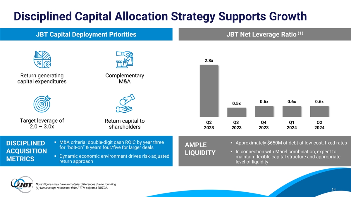 Forward-Looking and Non-GAAP Statements This presentation contains forward-looking statements as defined in the Private Securities Litigation Reform Act of 1995. Forward-looking statements are information of a non-historical nature and are subject to risks and uncertainties that are beyond JBT’s ability to control. These forward-looking statements include, among others, statements relating to our business and our results of operations, a potential transaction with Marel, our strategic plans, our restructuring plans and expected cost savings from those plans, and our liquidity. The factors that could cause our actual results to differ materially from expectations include, but are not limited to, the following factors: the occurrence of any event, change or other circumstances that could give rise to the termination or abandonment of the voluntary takeover offer to acquire all issued and outstanding shares of Marel (the “Offer”); the expected timing and likelihood of completion of the proposed transaction with Marel, including the timing, receipt and terms and conditions of any required governmental and regulatory approvals for the Offer that could reduce anticipated benefits or cause the parties to abandon the transaction; the risk that Marel and/or JBT may not be able to satisfy the conditions to the Offer in a timely manner or at all; the risk that the Offer and its announcement could have an adverse effect on the ability of JBT and Marel to retain customers and retain and hire key personnel and maintain relationships with their suppliers and customers, and on their operating results and businesses generally; the risk that problems may arise in successfully integrating the businesses of Marel and JBT, which may result in the combined company not operating as effectively and efficiently as expected; the risk that the combined company may be unable to achieve cost-cutting synergies or that it may take longer than expected to achieve those synergies; fluctuations in our financial results; unanticipated delays or accelerations in our sales cycles; deterioration of economic conditions, including impacts from supply chain delays and reduced material or component availability; inflationary pressures, including increases in energy, raw material, freight and labor costs; disruptions in the political, regulatory, economic and social conditions of the countries in which we conduct business; changes to trade regulation, quotas, duties or tariffs; fluctuations in currency exchange rates; changes in food consumption patterns; impacts of pandemic illnesses, food borne illnesses and diseases to various agricultural products; weather conditions and natural disasters; the impact of climate change and environmental protection initiatives; acts of terrorism or war, including the ongoing conflicts in Ukraine and the Middle East; termination or loss of major customer contracts and risks associated with fixed-price contracts, particularly during periods of high inflation; customer sourcing initiatives; competition and innovation in our industries; our ability to develop and introduce new or enhanced products and services and keep pace with technological developments; difficulty in developing, preserving and protecting our intellectual property or defending claims of infringement; catastrophic loss at any of our facilities and business continuity of our information systems; cyber-security risks such as network intrusion or ransomware schemes; loss of key management and other personnel; potential liability arising out of the installation or use of our systems; our ability to comply with U.S. and international laws governing our operations and industries; increases in tax liabilities; work stoppages; fluctuations in interest rates and returns on pension assets; a systemic failure of the banking system in the United States or globally impacting our customers’ financial condition and their demand for our goods and services; availability of and access to financial and other resources; the risk factors discussed in our proxy statement/prospectus filed pursuant to Rule 424(b) under the Securities Act of 1933, as amended (the “Securities Act”), on June 25, 2024 (the “Proxy Statement/Prospectus”), forming part of the Registration Statement on Form S-4 (File No. 333-279438) (the “Registration Statement”), initially filed by us on May 15, 2024 and declared effective on June 25, 2024; and other factors described under the captions “Risk Factors” and “Management’s Discussion and Analysis of Financial Condition and Results of Operations” in JBT’s most recent Annual Report on Form 10-K filed with the U.S. Securities and Exchange Commission (the “SEC”) and in any subsequently filed Quarterly Reports on Form 10-Q. JBT cautions shareholders and prospective investors that actual results may differ materially from those indicated by the forward-looking statements. JBT undertakes no obligation to publicly update or revise any forward-looking statements whether as a result of new information, future developments, subsequent events or changes in circumstances or otherwise. JBT provides non-GAAP financial measures in order to increase transparency in our operating results and trends. These non-GAAP measures eliminate certain costs or benefits from, or change the calculation of, a measure as calculated under U.S. GAAP. By eliminating these items, JBT provides a more meaningful comparison of our ongoing operating results, consistent with how management evaluates performance. Management uses these non-GAAP measures in financial and operational evaluation, planning and forecasting. These calculations may differ from similarly-titled measures used by other companies. The non-GAAP financial measures disclosed are not intended to be used as a substitute for, nor should they be considered in isolation of, financial measures prepared in accordance with U.S. GAAP. 2