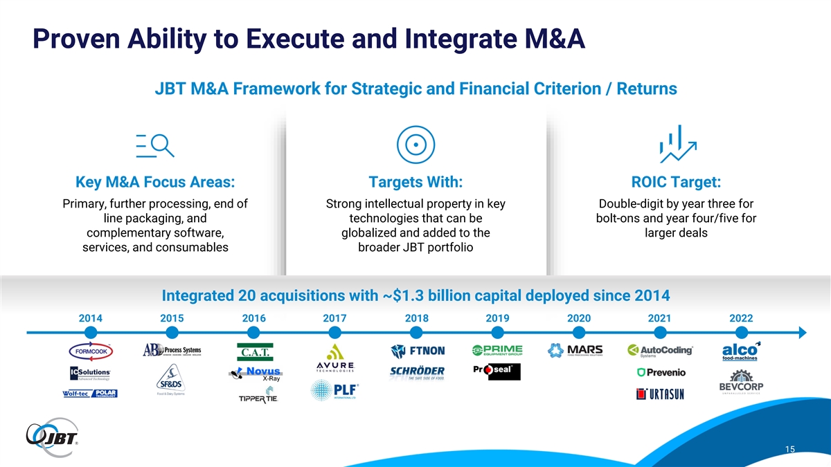 Disciplined Capital Allocation Strategy Supports Growth (1) JBT Capital Deployment Priorities JBT Net Leverage Ratio 2.8x Return generating Complementary capital expenditures M&A 0.6x 0.6x 0.6x 0.5x Target leverage of Return capital to Q2 Q3 Q4 Q1 Q2 2.0 – 3.0x shareholders 2023 2023 2023 2024 2024 ▪ M&A criteria: double-digit cash ROIC by year three ▪ Approximately $650M of debt at low-cost, fixed rates DISCIPLINED AMPLE for “bolt-on” & years four/five for larger deals ACQUISITION ▪ In connection with Marel combination, expect to LIQUIDITY ▪ Dynamic economic environment drives risk-adjusted maintain flexible capital structure and appropriate METRICS return approach level of liquidity Note: Figures may have immaterial differences due to rounding. (1) Net leverage ratio is net debt / TTM adjusted EBITDA. 14
