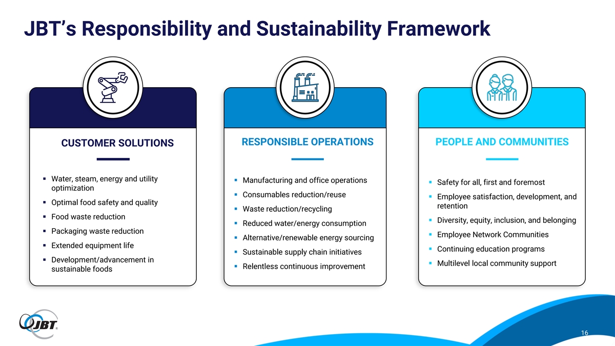 Proven Ability to Execute and Integrate M&A JBT M&A Framework for Strategic and Financial Criterion / Returns Key M&A Focus Areas: Targets With: ROIC Target: Primary, further processing, end of Strong intellectual property in key Double-digit by year three for line packaging, and technologies that can be bolt-ons and year four/five for complementary software, globalized and added to the larger deals services, and consumables broader JBT portfolio Integrated 20 acquisitions with ~$1.3 billion capital deployed since 2014 2014 2015 2016 2017 2018 2019 2020 2021 2022 15