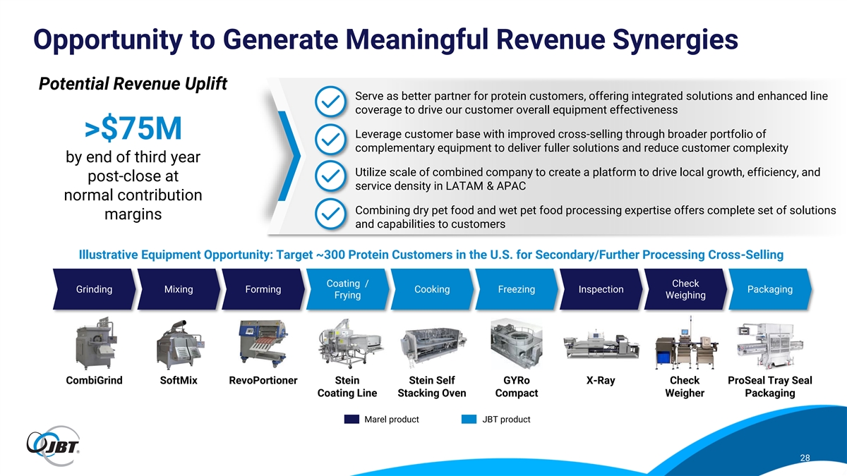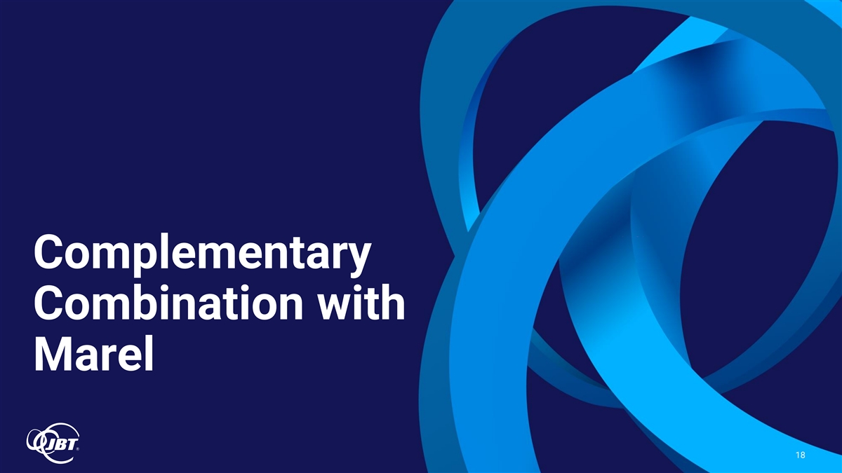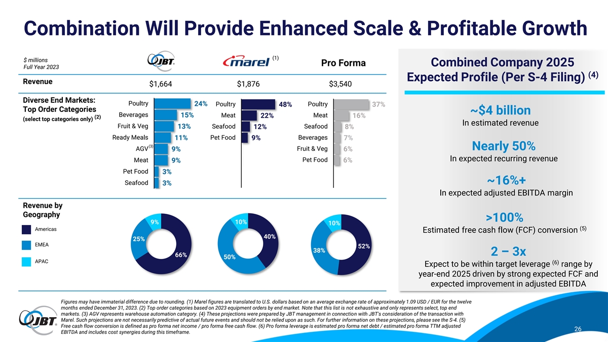 Combination Will Provide Enhanced Scale & Profitable Growth (1) $ millions Pro Forma Combined Company 2025 Full Year 2023 (4) Expected Profile (Per S-4 Filing) Revenue $1,664 $1,876 $3,540 Diverse End Markets: Poultry 24% Poultry Poultry 48% 37% Top Order Categories ~$4 billion Beverages Meat 15% Meat 22% 16% (2) (select top categories only) In estimated revenue Fruit & Veg 13% Seafood Seafood 12% 8% Ready Meals 11% Pet Food Beverages 9% 7% (3) Nearly 50% AGV Fruit & Veg 9% 0% 6% In expected recurring revenue Meat Pet Food 9% 0% 6% Pet Food 0% 3% Seafood 0% ~16%+ 3% In expected adjusted EBITDA margin Revenue by Geography >100% 9% 10% 10% (5) Americas Estimated free cash flow (FCF) conversion 40% 25% EMEA 52% 38% 2 – 3x 66% 50% APAC (6) Expect to be within target leverage range by year-end 2025 driven by strong expected FCF and expected improvement in adjusted EBITDA Figures may have immaterial difference due to rounding. (1) Marel figures are translated to U.S. dollars based on an average exchange rate of approximately 1.09 USD / EUR for the twelve months ended December 31, 2023. (2) Top order categories based on 2023 equipment orders by end market. Note that this list is not exhaustive and only represents select, top end markets. (3) AGV represents warehouse automation category. (4) These projections were prepared by JBT management in connection with JBT's consideration of the transaction with Marel. Such projections are not necessarily predictive of actual future events and should not be relied upon as such. For further information on these projections, please see the S-4. (5) Free cash flow conversion is defined as pro forma net income / pro forma free cash flow. (6) Pro forma leverage is estimated pro forma net debt / estimated pro forma TTM adjusted 26 EBITDA and includes cost synergies during this timeframe.