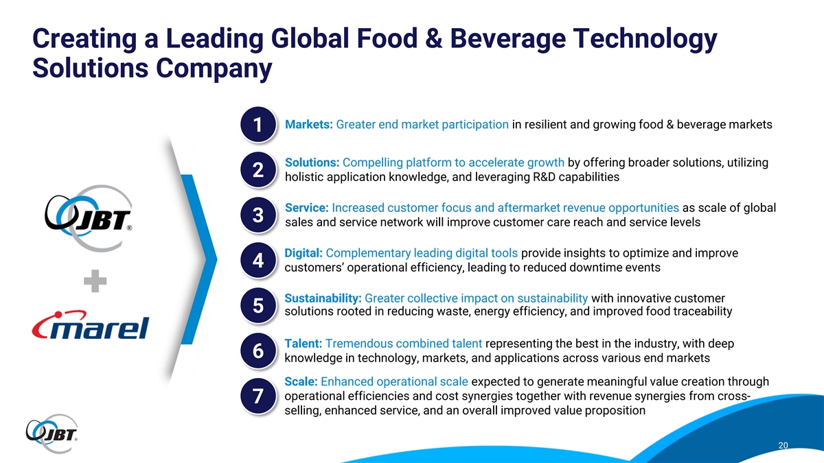 S c O a p l e e r a a n t d i o R n i g a o l r d e t h n c e t l a a E m T n n h U a n c G e r d o JBT and Marel: Aligned to Transform Food Processing and Fortify the Future of Food Customer Benefits Improved Increased Ease of Doing Aligned to Transform Outcomes Uptime Business the Way Food is Processed and Fortify the Future Enabled by Purpose-Driven Talent Organization of Food Broad application Global service Innovating to solve Continuously knowledge and support customer pain points improving 19 P w t r h o f r i s t e p a m i b h o l t e s s n u o C i t p a S e l e e u D R s t F a o i c n u a s b i l i t y