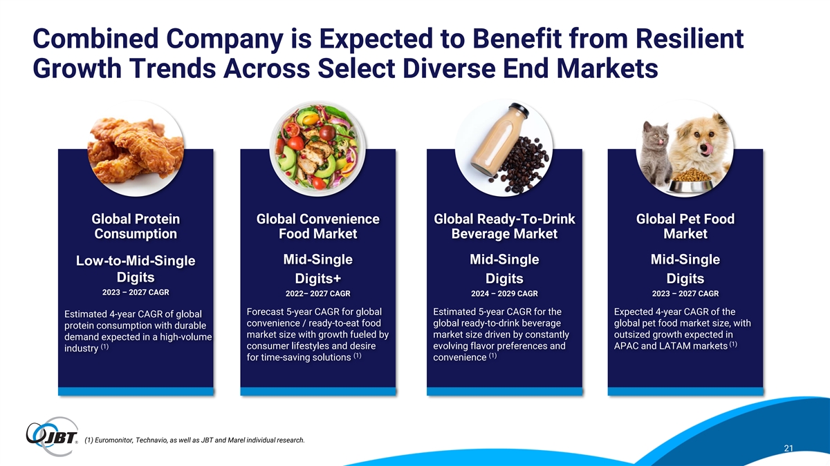 Creating a Leading Global Food & Beverage Technology Solutions Company Markets: Greater end market participation in resilient and growing food & beverage markets 1 Solutions: Compelling platform to accelerate growth by offering broader solutions, utilizing 2 holistic application knowledge, and leveraging R&D capabilities Service: Increased customer focus and aftermarket revenue opportunities as scale of global 3 sales and service network will improve customer care reach and service levels Digital: Complementary leading digital tools provide insights to optimize and improve 4 customers’ operational efficiency, leading to reduced downtime events Sustainability: Greater collective impact on sustainability with innovative customer 5 solutions rooted in reducing waste, energy efficiency, and improved food traceability Talent: Tremendous combined talent representing the best in the industry, with deep 6 knowledge in technology, markets, and applications across various end markets Scale: Enhanced operational scale expected to generate meaningful value creation through operational efficiencies and cost synergies together with revenue synergies from cross- 7 selling, enhanced service, and an overall improved value proposition 20