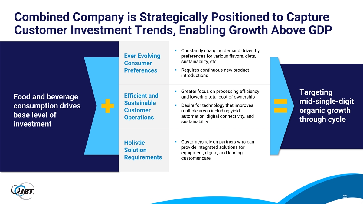 Combined Company is Expected to Benefit from Resilient Growth Trends Across Select Diverse End Markets Global Protein Global Convenience Global Ready-To-Drink Global Pet Food Consumption Food Market Beverage Market Market Mid-Single Mid-Single Mid-Single Low-to-Mid-Single Digits Digits+ Digits Digits 2023 – 2027 CAGR 2022– 2027 CAGR 2024 – 2029 CAGR 2023 – 2027 CAGR Forecast 5-year CAGR for global Estimated 5-year CAGR for the Expected 4-year CAGR of the Estimated 4-year CAGR of global convenience / ready-to-eat food global ready-to-drink beverage global pet food market size, with protein consumption with durable market size with growth fueled by market size driven by constantly outsized growth expected in demand expected in a high-volume (1) (1) consumer lifestyles and desire evolving flavor preferences and APAC and LATAM markets industry (1) (1) for time-saving solutions convenience (1) Euromonitor, Technavio, as well as JBT and Marel individual research. 21