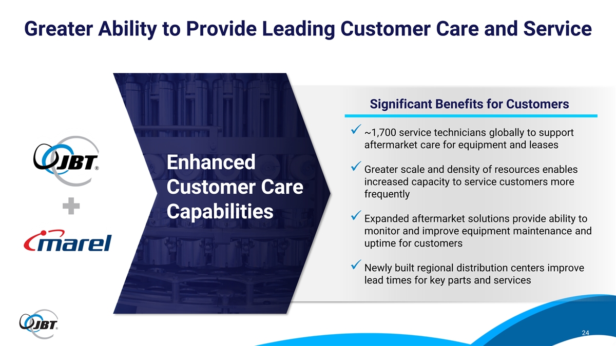 Complementary Core Technologies in Protein and Pet Food Processing Support Broader Portfolio Offering for Customers Benefits of Fuller Solutions Primary processing Secondary Further End of line Cut-up, de-boning, Forming, coating, Handling, Killing, stunning, eviscerating, cooking, freezing, etc. packaging, etc. skinning, portioning, etc. chilling, etc. ✓ Deeper portfolio of market leading Poultry technology, with advanced application (Illustrative) and process knowledge ✓ Ability to better address customer needs with line solutions that offer seamless flow and efficiency ✓ Allows similar customer base to access Primary processing Further End of line Secondary broader solution set globally Food safety, inspection, Mixing, extrusion, filling, Cooking, Tray sealing, clipping & raw material handling, etc. forming, etc. freezing, etc. packaging, etc. ✓ Utilize scaled combined service and Pet aftermarket support organization to Food improve performance and customer (Illustrative) uptime JBT equipment offering Marel equipment offering JBT and Marel offerings 23