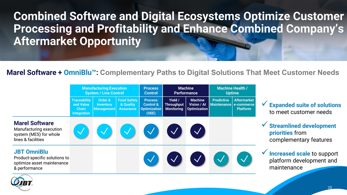 Combined Software and Digital Ecosystems Optimize Customer Processing and Profitability and Enhance Combined Company’s Aftermarket Opportunity Marel Software + OmniBlu : Complementary Paths to Digital Solutions That Meet Customer Needs Manufacturing Execution Process Machine Machine Health / System / Line Control Control Performance Uptime Traceability Order & Food Safety Process Yield / Machine Predictive Aftermarket and Value Inventory & Quality Control & Throughput Vision / AI Maintenance e-commerce ✓ Expanded suite of solutions Chain Management Assurance Optimization Monitoring Optimization Platform to meet customer needs Integration (OEE) Marel Software ✓ Streamlined development Manufacturing execution priorities from system (MES) for whole lines & facilities complementary features JBT OmniBlu ✓ Increased scale to support Product-specific solutions to platform development and optimize asset maintenance maintenance & performance 25