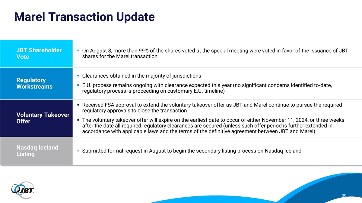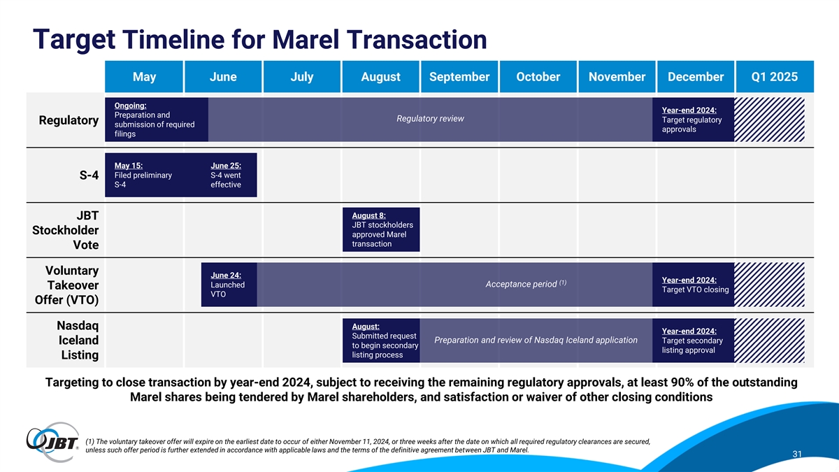 Marel Transaction Update JBT Shareholder ▪ On August 8, more than 99% of the shares voted at the special meeting were voted in favor of the issuance of JBT shares for the Marel transaction Vote ▪ Clearances obtained in the majority of jurisdictions Regulatory ▪ E.U. process remains ongoing with clearance expected this year (no significant concerns identified to-date, Workstreams regulatory process is proceeding on customary E.U. timeline) ▪ Received FSA approval to extend the voluntary takeover offer as JBT and Marel continue to pursue the required regulatory approvals to close the transaction Voluntary Takeover ▪ The voluntary takeover offer will expire on the earliest date to occur of either November 11, 2024, or three weeks Offer after the date all required regulatory clearances are secured (unless such offer period is further extended in accordance with applicable laws and the terms of the definitive agreement between JBT and Marel) Nasdaq Iceland ▪ Submitted formal request in August to begin the secondary listing process on Nasdaq Iceland Listing 30