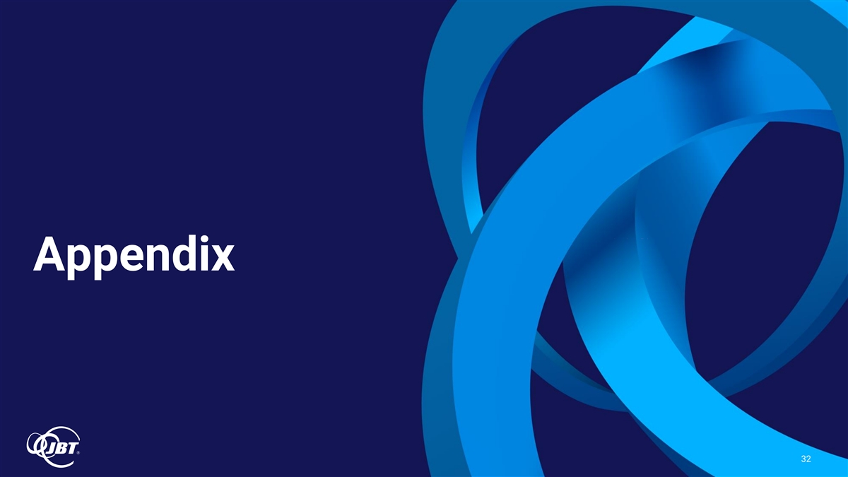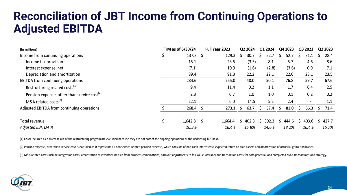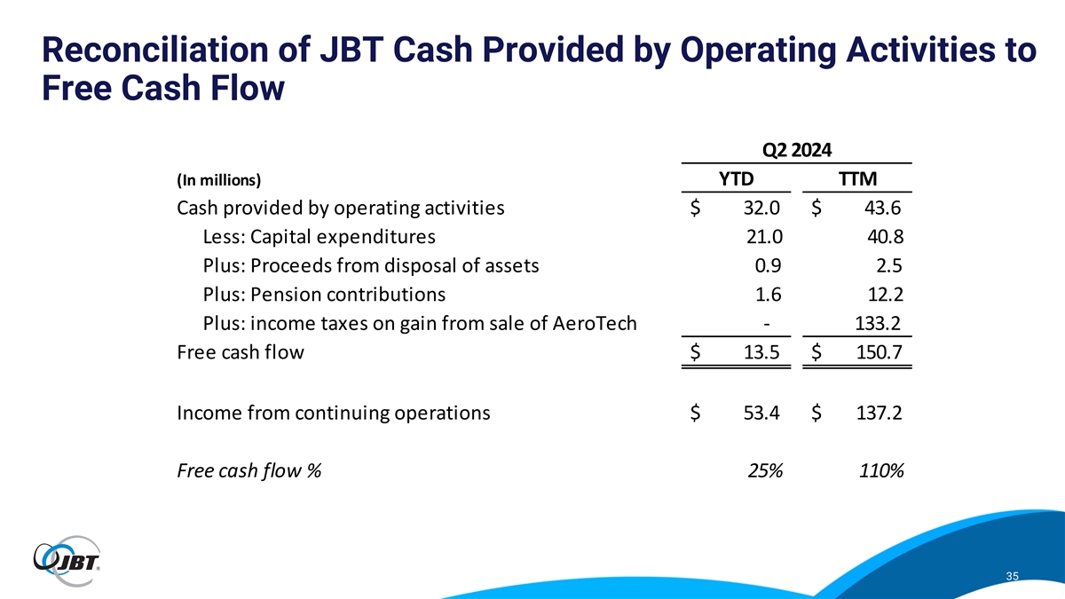 Reconciliation of JBT Cash Provided by Operating Activities to Free Cash Flow Q2 2024 (In millions) YTD TTM Cash provided by operating activities $ 32.0 $ 43.6 Less: Capital expenditures 21.0 40.8 Plus: Proceeds from disposal of assets 0.9 2.5 Plus: Pension contributions 1.6 12.2 Plus: income taxes on gain from sale of AeroTech - 133.2 Free cash flow $ 13.5 $ 150.7 Income from continuing operations $ 53.4 $ 137.2 Free cash flow % 25% 110% 35