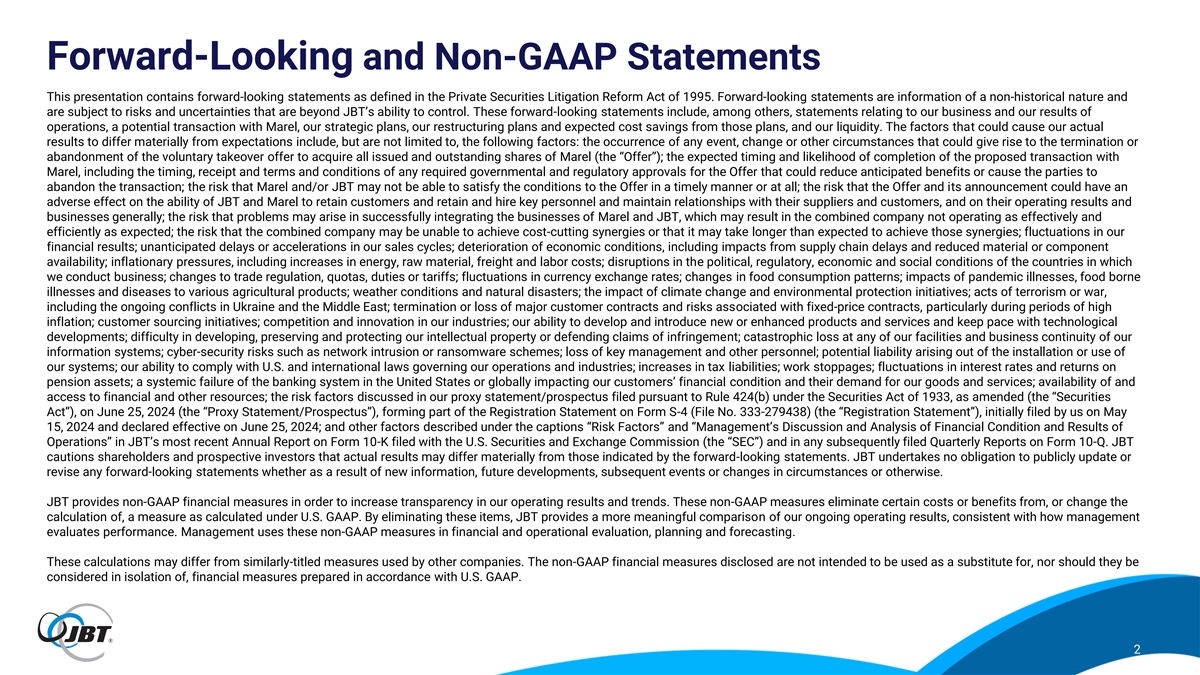 Forward-Looking and Non-GAAP Statements This presentation contains forward-looking statements as defined in the Private Securities Litigation Reform Act of 1995. Forward-looking statements are information of a non-historical nature and are subject to risks and uncertainties that are beyond JBT’s ability to control. These forward-looking statements include, among others, statements relating to our business and our results of operations, a potential transaction with Marel, our strategic plans, our restructuring plans and expected cost savings from those plans, and our liquidity. The factors that could cause our actual results to differ materially from expectations include, but are not limited to, the following factors: the occurrence of any event, change or other circumstances that could give rise to the termination or abandonment of the voluntary takeover offer to acquire all issued and outstanding shares of Marel (the “Offer”); the expected timing and likelihood of completion of the proposed transaction with Marel, including the timing, receipt and terms and conditions of any required governmental and regulatory approvals for the Offer that could reduce anticipated benefits or cause the parties to abandon the transaction; the risk that Marel and/or JBT may not be able to satisfy the conditions to the Offer in a timely manner or at all; the risk that the Offer and its announcement could have an adverse effect on the ability of JBT and Marel to retain customers and retain and hire key personnel and maintain relationships with their suppliers and customers, and on their operating results and businesses generally; the risk that problems may arise in successfully integrating the businesses of Marel and JBT, which may result in the combined company not operating as effectively and efficiently as expected; the risk that the combined company may be unable to achieve cost-cutting synergies or that it may take longer than expected to achieve those synergies; fluctuations in our financial results; unanticipated delays or accelerations in our sales cycles; deterioration of economic conditions, including impacts from supply chain delays and reduced material or component availability; inflationary pressures, including increases in energy, raw material, freight and labor costs; disruptions in the political, regulatory, economic and social conditions of the countries in which we conduct business; changes to trade regulation, quotas, duties or tariffs; fluctuations in currency exchange rates; changes in food consumption patterns; impacts of pandemic illnesses, food borne illnesses and diseases to various agricultural products; weather conditions and natural disasters; the impact of climate change and environmental protection initiatives; acts of terrorism or war, including the ongoing conflicts in Ukraine and the Middle East; termination or loss of major customer contracts and risks associated with fixed-price contracts, particularly during periods of high inflation; customer sourcing initiatives; competition and innovation in our industries; our ability to develop and introduce new or enhanced products and services and keep pace with technological developments; difficulty in developing, preserving and protecting our intellectual property or defending claims of infringement; catastrophic loss at any of our facilities and business continuity of our information systems; cyber-security risks such as network intrusion or ransomware schemes; loss of key management and other personnel; potential liability arising out of the installation or use of our systems; our ability to comply with U.S. and international laws governing our operations and industries; increases in tax liabilities; work stoppages; fluctuations in interest rates and returns on pension assets; a systemic failure of the banking system in the United States or globally impacting our customers’ financial condition and their demand for our goods and services; availability of and access to financial and other resources; the risk factors discussed in our proxy statement/prospectus filed pursuant to Rule 424(b) under the Securities Act of 1933, as amended (the “Securities Act”), on June 25, 2024 (the “Proxy Statement/Prospectus”), forming part of the Registration Statement on Form S-4 (File No. 333-279438) (the “Registration Statement”), initially filed by us on May 15, 2024 and declared effective on June 25, 2024; and other factors described under the captions “Risk Factors” and “Management’s Discussion and Analysis of Financial Condition and Results of Operations” in JBT’s most recent Annual Report on Form 10-K filed with the U.S. Securities and Exchange Commission (the “SEC”) and in any subsequently filed Quarterly Reports on Form 10-Q. JBT cautions shareholders and prospective investors that actual results may differ materially from those indicated by the forward-looking statements. JBT undertakes no obligation to publicly update or revise any forward-looking statements whether as a result of new information, future developments, subsequent events or changes in circumstances or otherwise. JBT provides non-GAAP financial measures in order to increase transparency in our operating results and trends. These non-GAAP measures eliminate certain costs or benefits from, or change the calculation of, a measure as calculated under U.S. GAAP. By eliminating these items, JBT provides a more meaningful comparison of our ongoing operating results, consistent with how management evaluates performance. Management uses these non-GAAP measures in financial and operational evaluation, planning and forecasting. These calculations may differ from similarly-titled measures used by other companies. The non-GAAP financial measures disclosed are not intended to be used as a substitute for, nor should they be considered in isolation of, financial measures prepared in accordance with U.S. GAAP. 2