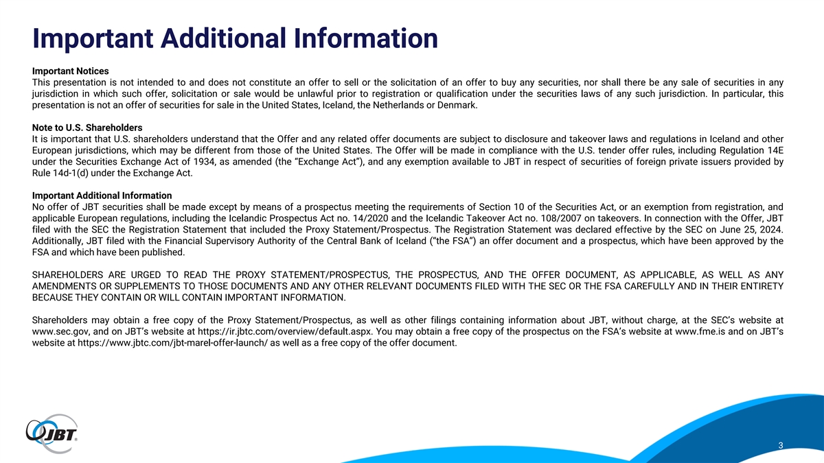 Forward-Looking and Non-GAAP Statements This presentation contains forward-looking statements as defined in the Private Securities Litigation Reform Act of 1995. Forward-looking statements are information of a non-historical nature and are subject to risks and uncertainties that are beyond JBT’s ability to control. These forward-looking statements include, among others, statements relating to our business and our results of operations, a potential transaction with Marel, our strategic plans, our restructuring plans and expected cost savings from those plans, and our liquidity. The factors that could cause our actual results to differ materially from expectations include, but are not limited to, the following factors: the occurrence of any event, change or other circumstances that could give rise to the termination or abandonment of the voluntary takeover offer to acquire all issued and outstanding shares of Marel (the “Offer”); the expected timing and likelihood of completion of the proposed transaction with Marel, including the timing, receipt and terms and conditions of any required governmental and regulatory approvals for the Offer that could reduce anticipated benefits or cause the parties to abandon the transaction; the risk that Marel and/or JBT may not be able to satisfy the conditions to the Offer in a timely manner or at all; the risk that the Offer and its announcement could have an adverse effect on the ability of JBT and Marel to retain customers and retain and hire key personnel and maintain relationships with their suppliers and customers, and on their operating results and businesses generally; the risk that problems may arise in successfully integrating the businesses of Marel and JBT, which may result in the combined company not operating as effectively and efficiently as expected; the risk that the combined company may be unable to achieve cost-cutting synergies or that it may take longer than expected to achieve those synergies; fluctuations in our financial results; unanticipated delays or accelerations in our sales cycles; deterioration of economic conditions, including impacts from supply chain delays and reduced material or component availability; inflationary pressures, including increases in energy, raw material, freight and labor costs; disruptions in the political, regulatory, economic and social conditions of the countries in which we conduct business; changes to trade regulation, quotas, duties or tariffs; fluctuations in currency exchange rates; changes in food consumption patterns; impacts of pandemic illnesses, food borne illnesses and diseases to various agricultural products; weather conditions and natural disasters; the impact of climate change and environmental protection initiatives; acts of terrorism or war, including the ongoing conflicts in Ukraine and the Middle East; termination or loss of major customer contracts and risks associated with fixed-price contracts, particularly during periods of high inflation; customer sourcing initiatives; competition and innovation in our industries; our ability to develop and introduce new or enhanced products and services and keep pace with technological developments; difficulty in developing, preserving and protecting our intellectual property or defending claims of infringement; catastrophic loss at any of our facilities and business continuity of our information systems; cyber-security risks such as network intrusion or ransomware schemes; loss of key management and other personnel; potential liability arising out of the installation or use of our systems; our ability to comply with U.S. and international laws governing our operations and industries; increases in tax liabilities; work stoppages; fluctuations in interest rates and returns on pension assets; a systemic failure of the banking system in the United States or globally impacting our customers’ financial condition and their demand for our goods and services; availability of and access to financial and other resources; the risk factors discussed in our proxy statement/prospectus filed pursuant to Rule 424(b) under the Securities Act of 1933, as amended (the “Securities Act”), on June 25, 2024 (the “Proxy Statement/Prospectus”), forming part of the Registration Statement on Form S-4 (File No. 333-279438) (the “Registration Statement”), initially filed by us on May 15, 2024 and declared effective on June 25, 2024; and other factors described under the captions “Risk Factors” and “Management’s Discussion and Analysis of Financial Condition and Results of Operations” in JBT’s most recent Annual Report on Form 10-K filed with the U.S. Securities and Exchange Commission (the “SEC”) and in any subsequently filed Quarterly Reports on Form 10-Q. JBT cautions shareholders and prospective investors that actual results may differ materially from those indicated by the forward-looking statements. JBT undertakes no obligation to publicly update or revise any forward-looking statements whether as a result of new information, future developments, subsequent events or changes in circumstances or otherwise. JBT provides non-GAAP financial measures in order to increase transparency in our operating results and trends. These non-GAAP measures eliminate certain costs or benefits from, or change the calculation of, a measure as calculated under U.S. GAAP. By eliminating these items, JBT provides a more meaningful comparison of our ongoing operating results, consistent with how management evaluates performance. Management uses these non-GAAP measures in financial and operational evaluation, planning and forecasting. These calculations may differ from similarly-titled measures used by other companies. The non-GAAP financial measures disclosed are not intended to be used as a substitute for, nor should they be considered in isolation of, financial measures prepared in accordance with U.S. GAAP. 2
