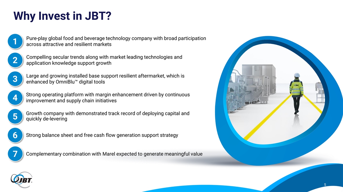 Important Additional Information Important Notices This presentation is not intended to and does not constitute an offer to sell or the solicitation of an offer to buy any securities, nor shall there be any sale of securities in any jurisdiction in which such offer, solicitation or sale would be unlawful prior to registration or qualification under the securities laws of any such jurisdiction. In particular, this presentation is not an offer of securities for sale in the United States, Iceland, the Netherlands or Denmark. Note to U.S. Shareholders It is important that U.S. shareholders understand that the Offer and any related offer documents are subject to disclosure and takeover laws and regulations in Iceland and other European jurisdictions, which may be different from those of the United States. The Offer will be made in compliance with the U.S. tender offer rules, including Regulation 14E under the Securities Exchange Act of 1934, as amended (the “Exchange Act”), and any exemption available to JBT in respect of securities of foreign private issuers provided by Rule 14d-1(d) under the Exchange Act. Important Additional Information No offer of JBT securities shall be made except by means of a prospectus meeting the requirements of Section 10 of the Securities Act, or an exemption from registration, and applicable European regulations, including the Icelandic Prospectus Act no. 14/2020 and the Icelandic Takeover Act no. 108/2007 on takeovers. In connection with the Offer, JBT filed with the SEC the Registration Statement that included the Proxy Statement/Prospectus. The Registration Statement was declared effective by the SEC on June 25, 2024. Additionally, JBT filed with the Financial Supervisory Authority of the Central Bank of Iceland (“the FSA”) an offer document and a prospectus, which have been approved by the FSA and which have been published. SHAREHOLDERS ARE URGED TO READ THE PROXY STATEMENT/PROSPECTUS, THE PROSPECTUS, AND THE OFFER DOCUMENT, AS APPLICABLE, AS WELL AS ANY AMENDMENTS OR SUPPLEMENTS TO THOSE DOCUMENTS AND ANY OTHER RELEVANT DOCUMENTS FILED WITH THE SEC OR THE FSA CAREFULLY AND IN THEIR ENTIRETY BECAUSE THEY CONTAIN OR WILL CONTAIN IMPORTANT INFORMATION. Shareholders may obtain a free copy of the Proxy Statement/Prospectus, as well as other filings containing information about JBT, without charge, at the SEC’s website at www.sec.gov, and on JBT’s website at https://ir.jbtc.com/overview/default.aspx. You may obtain a free copy of the prospectus on the FSA’s website at www.fme.is and on JBT’s website at https://www.jbtc.com/jbt-marel-offer-launch/ as well as a free copy of the offer document. 3