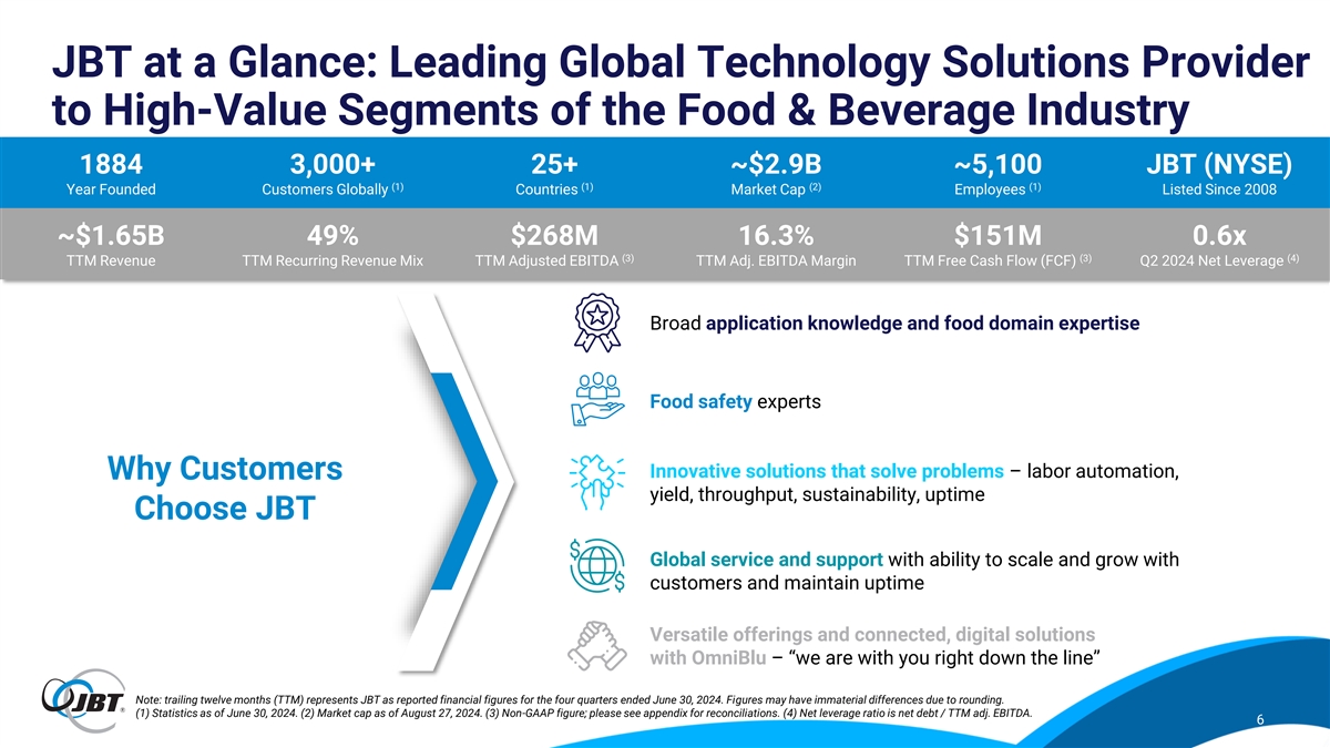Why Invest in JBT? Pure-play global food and beverage technology company with broad participation 1 across attractive and resilient markets Compelling secular trends along with market leading technologies and 2 application knowledge support growth Large and growing installed base support resilient aftermarket, which is 3 enhanced by OmniBlu digital tools Strong operating platform with margin enhancement driven by continuous 4 improvement and supply chain initiatives Growth company with demonstrated track record of deploying capital and 5 quickly de-levering Strong balance sheet and free cash flow generation support strategy 6 Complementary combination with Marel expected to generate meaningful value 7 5