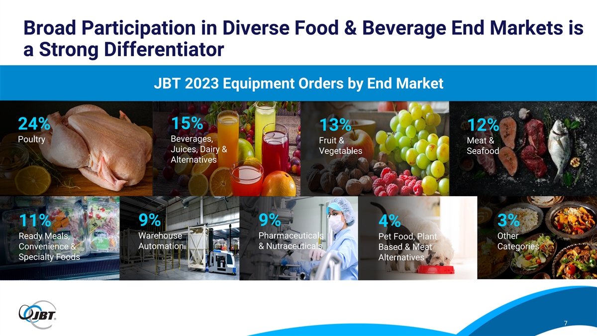 Broad Participation in Diverse Food & Beverage End Markets is a Strong Differentiator JBT 2023 Equipment Orders by End Market 24% 15% 13% 12% Beverages, Poultry Fruit & Meat & Juices, Dairy & Vegetables Seafood Alternatives 9% 9% 11% 3% 4% Ready Meals, Warehouse Pharmaceuticals Other Pet Food, Plant Automation & Nutraceuticals Convenience & Categories Based & Meat Specialty Foods Alternatives 7
