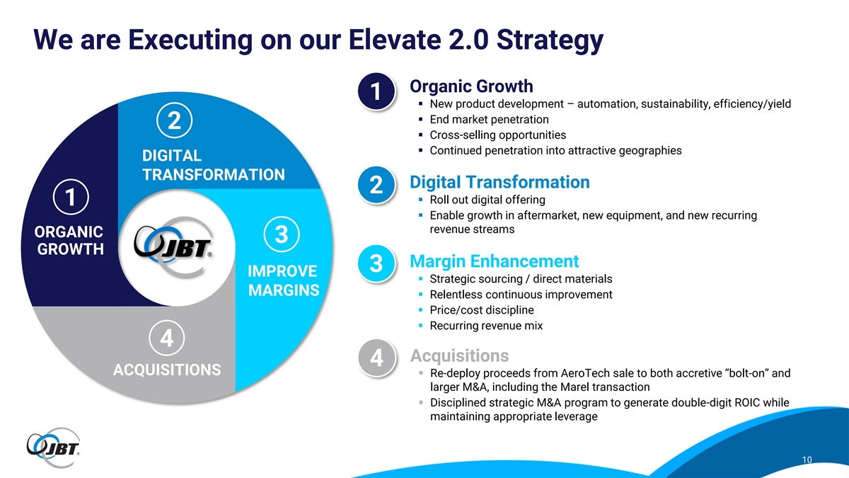 Demonstrated Resiliency Through the Cycle with Recurring Revenue Model Leveraging Large Global Installed Base JBT Recurring Revenue ($ millions) Recurring Revenue Driven by Sales and Service Network $846 $751 ▪ ~600 field service technicians globally support equipment and leases $662 Parts & Consumables $611 ▪ Cross-training for increased regional support and 60% $587 utilization $518 $486 ▪ Increased selling of aftermarket support contracts with equipment sales – developing more parts kits Refurbishments vs. single-part sales 14% Service ▪ Generating new opportunities through 14% Leases increased focus on outbound aftermarket sales 12% ▪ Over 50,000 global install base of machinery 2017 2018 2019 2020 2021 2022 2023 Recurring (1) 41.5% 38.1% 44.1% 49.5% 47.2% 47.2% 50.8% Revenue % Note: Figures may have immaterial differences due to rounding. (1) 2018 revenue was positively impacted by the adoption of ASC 606 revenue recognition policy, impacting total revenue by approximately $114 million. 9