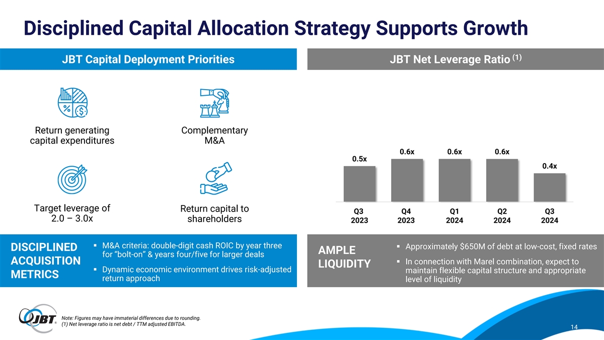 Forward-Looking and Non-GAAP Statements This presentation contains forward-looking statements as defined in the Private Securities Litigation Reform Act of 1995. Forward-looking statements are information of a non-historical nature and are subject to risks and uncertainties that are beyond JBT’s ability to control. These forward-looking statements include, among others, statements relating to our business and our results of operations, a potential transaction with Marel, our strategic plans, our restructuring plans and expected cost savings from those plans, and our liquidity. The factors that could cause our actual results to differ materially from expectations include, but are not limited to, the following factors: the occurrence of any event, change or other circumstances that could give rise to the termination or abandonment of the voluntary takeover offer to acquire all issued and outstanding shares of Marel (the “Offer”); the expected timing and likelihood of completion of the proposed transaction with Marel, including the timing, receipt and terms and conditions of any required governmental and regulatory approvals for the Offer that could reduce anticipated benefits or cause the parties to abandon the transaction; the risk that Marel and/or JBT may not be able to satisfy the conditions to the Offer in a timely manner or at all; the risk that the Offer and its announcement could have an adverse effect on the ability of JBT and Marel to retain customers and retain and hire key personnel and maintain relationships with their suppliers and customers, and on their operating results and businesses generally; the risk that problems may arise in successfully integrating the businesses of Marel and JBT, which may result in the combined company not operating as effectively and efficiently as expected; the risk that the combined company may be unable to achieve cost-cutting synergies or that it may take longer than expected to achieve those synergies; fluctuations in our financial results; unanticipated delays or accelerations in our sales cycles; deterioration of economic conditions, including impacts from supply chain delays and reduced material or component availability; inflationary pressures, including increases in energy, raw material, freight and labor costs; disruptions in the political, regulatory, economic and social conditions of the countries in which we conduct business; changes to trade regulation, quotas, duties or tariffs; fluctuations in currency exchange rates; changes in food consumption patterns; impacts of pandemic illnesses, food borne illnesses and diseases to various agricultural products; weather conditions and natural disasters; the impact of climate change and environmental protection initiatives; acts of terrorism or war, including the ongoing conflicts in Ukraine and the Middle East; termination or loss of major customer contracts and risks associated with fixed-price contracts, particularly during periods of high inflation; customer sourcing initiatives; competition and innovation in our industries; our ability to develop and introduce new or enhanced products and services and keep pace with technological developments; difficulty in developing, preserving and protecting our intellectual property or defending claims of infringement; catastrophic loss at any of our facilities and business continuity of our information systems; cyber-security risks such as network intrusion or ransomware schemes; loss of key management and other personnel; potential liability arising out of the installation or use of our systems; our ability to comply with U.S. and international laws governing our operations and industries; increases in tax liabilities; work stoppages; fluctuations in interest rates and returns on pension assets; a systemic failure of the banking system in the United States or globally impacting our customers’ financial condition and their demand for our goods and services; availability of and access to financial and other resources; the risk factors discussed in our proxy statement/prospectus filed pursuant to Rule 424(b) under the Securities Act of 1933, as amended (the “Securities Act”), on June 25, 2024 (the “Proxy Statement/Prospectus”), forming part of the Registration Statement on Form S-4 (File No. 333-279438) (the “Registration Statement”), initially filed by us on May 15, 2024 and declared effective on June 25, 2024; and other factors described under the captions “Risk Factors” and “Management’s Discussion and Analysis of Financial Condition and Results of Operations” in JBT’s most recent Annual Report on Form 10-K filed with the U.S. Securities and Exchange Commission (the “SEC”) and in any subsequently filed Quarterly Reports on Form 10-Q. JBT cautions shareholders and prospective investors that actual results may differ materially from those indicated by the forward-looking statements. JBT undertakes no obligation to publicly update or revise any forward-looking statements whether as a result of new information, future developments, subsequent events or changes in circumstances or otherwise. JBT provides non-GAAP financial measures in order to increase transparency in our operating results and trends. These non-GAAP measures eliminate certain costs or benefits from, or change the calculation of, a measure as calculated under U.S. GAAP. By eliminating these items, JBT provides a more meaningful comparison of our ongoing operating results, consistent with how management evaluates performance. Management uses these non-GAAP measures in financial and operational evaluation, planning and forecasting. These calculations may differ from similarly-titled measures used by other companies. The non-GAAP financial measures disclosed are not intended to be used as a substitute for, nor should they be considered in isolation of, financial measures prepared in accordance with U.S. GAAP. 2