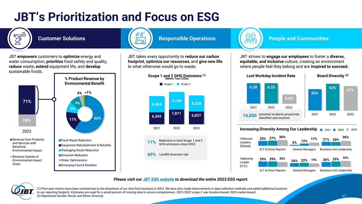 JBT’s Responsibility and Sustainability Framework RESPONSIBLE OPERATIONS PEOPLE AND COMMUNITIES CUSTOMER SOLUTIONS ▪ Water, steam, energy and utility ▪ Manufacturing and office operations ▪ Safety for all, first and foremost optimization ▪ Consumables reduction/reuse ▪ Employee satisfaction, development, and ▪ Optimal food safety and quality retention ▪ Waste reduction/recycling ▪ Food waste reduction ▪ Diversity, equity, inclusion, and belonging ▪ Reduced water/energy consumption ▪ Packaging waste reduction ▪ Employee Network Communities ▪ Alternative/renewable energy sourcing ▪ Extended equipment life ▪ Continuing education programs ▪ Sustainable supply chain initiatives ▪ Development/advancement in ▪ Multilevel local community support ▪ Relentless continuous improvement sustainable foods 16