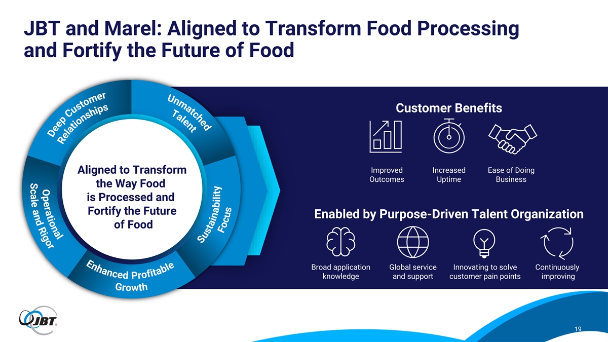 S c O a p l e e r a a n t d i o R n i g a o l r d e t h n c e t l a a E m T n n h U a n c G e r d o JBT and Marel: Aligned to Transform Food Processing and Fortify the Future of Food Customer Benefits Improved Increased Ease of Doing Aligned to Transform Outcomes Uptime Business the Way Food is Processed and Fortify the Future Enabled by Purpose-Driven Talent Organization of Food Broad application Global service Innovating to solve Continuously knowledge and support customer pain points improving 19 P w t r h o f r i s t e p a m i b h o l t e s s n u o C i t p a S e l e e u D R s t F a o i c n u a s b i l i t y