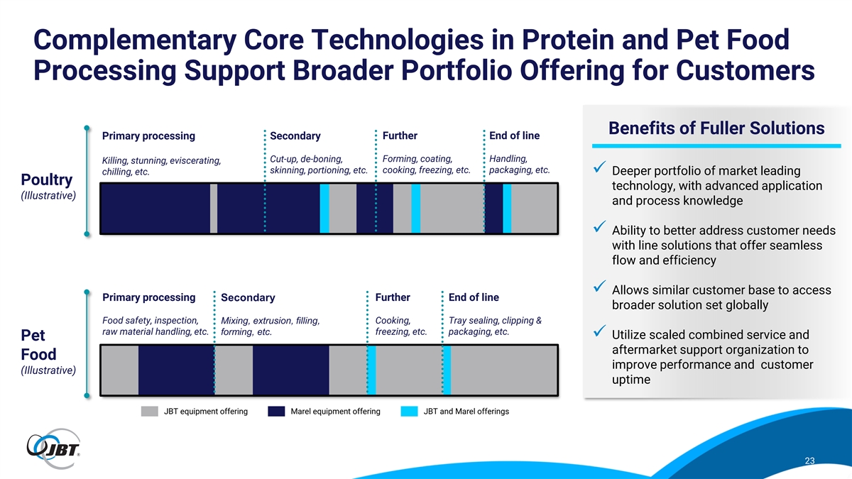 Combined Company is Strategically Positioned to Capture Customer Investment Trends, Enabling Growth Above GDP Company Vision ▪ Constantly changing demand driven by Ever Evolving preferences for various flavors, diets, sustainability, etc. Consumer ▪ Requires continuous new product Preferences introductions ▪ Greater focus on processing efficiency Targeting Efficient and and lowering total cost of ownership Food and beverage mid-single-digit Sustainable ▪ Desire for technology that improves consumption drives Customer multiple areas including yield, organic growth base level of automation, digital connectivity, and Operations through cycle sustainability investment ▪ Customers rely on partners who can Holistic provide integrated solutions for Solution equipment, digital, and leading Requirements customer care 22