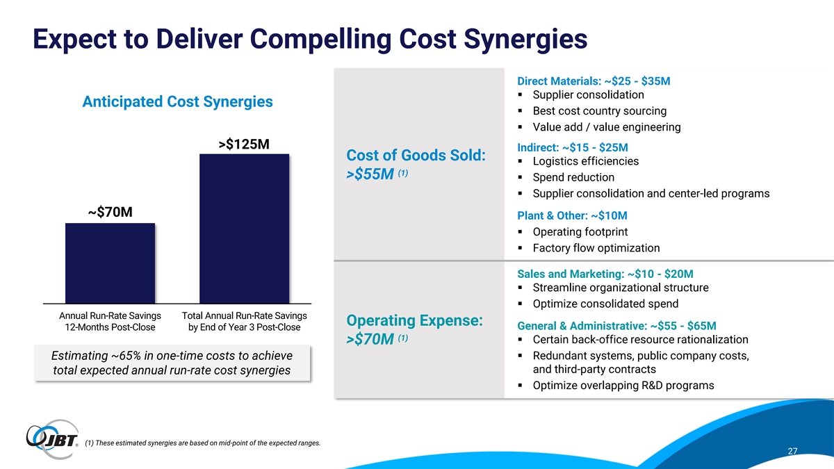Combination Will Provide Enhanced Scale & Profitable Growth (1) $ millions Pro Forma Combined Company 2025 Full Year 2023 (4) Expected Profile (Per S-4 Filing) Revenue $1,664 $1,876 $3,540 Diverse End Markets: Poultry 24% Poultry Poultry 48% 37% Top Order Categories ~$4 billion Beverages Meat 15% Meat 22% 16% (2) (select top categories only) In estimated revenue Fruit & Veg 13% Seafood Seafood 12% 8% Ready Meals 11% Pet Food Beverages 9% 7% (3) Nearly 50% AGV Fruit & Veg 9% 0% 6% In expected recurring revenue Meat Pet Food 9% 0% 6% Pet Food 0% 3% Seafood 0% ~16%+ 3% In expected adjusted EBITDA margin Revenue by Geography >100% 9% 10% 10% (5) Americas Estimated free cash flow (FCF) conversion 40% 25% EMEA 52% 38% 2 – 3x 66% 50% APAC (6) Expect to be within target leverage range by year-end 2025 driven by strong expected FCF and expected improvement in adjusted EBITDA Figures may have immaterial difference due to rounding. (1) Marel figures are translated to U.S. dollars based on an average exchange rate of approximately 1.09 USD / EUR for the twelve months ended December 31, 2023. (2) Top order categories based on 2023 equipment orders by end market. Note that this list is not exhaustive and only represents select, top end markets. (3) AGV represents warehouse automation category. (4) These projections were prepared by JBT management in connection with JBT's consideration of the transaction with Marel. Such projections are not necessarily predictive of actual future events and should not be relied upon as such. For further information on these projections, please see the S-4. (5) Free cash flow conversion is defined as pro forma net income / pro forma free cash flow. (6) Pro forma leverage is estimated pro forma net debt / estimated pro forma TTM adjusted 26 EBITDA and includes cost synergies during this timeframe.