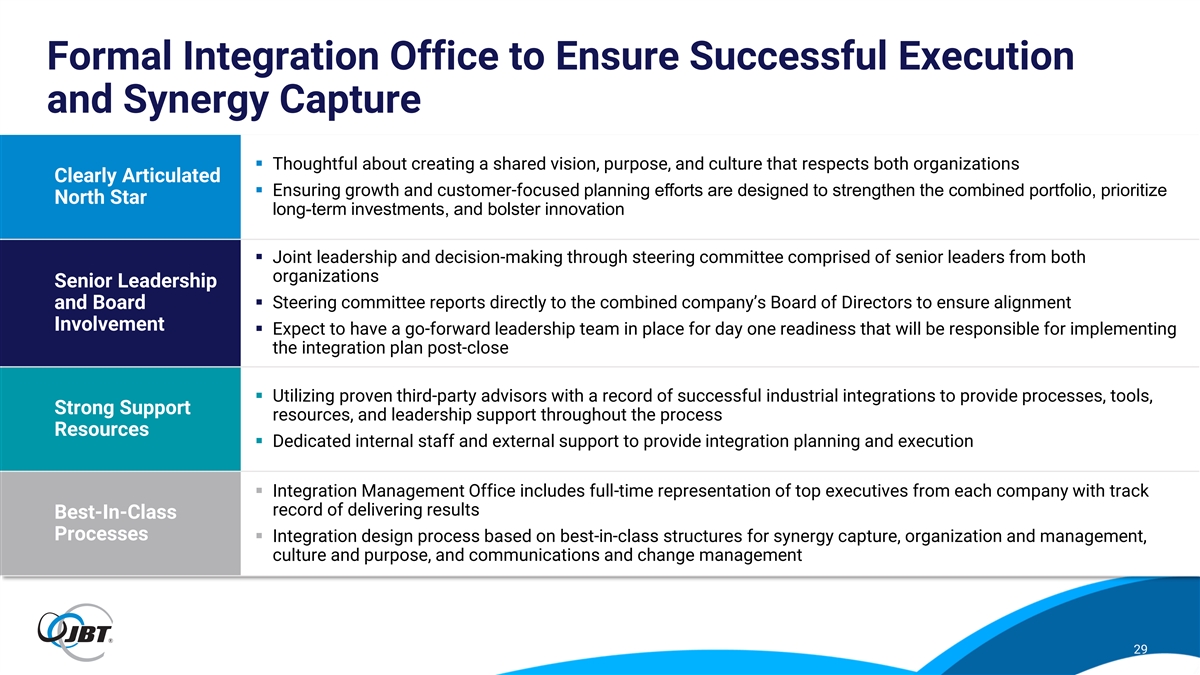 Opportunity to Generate Meaningful Revenue Synergies Potential Revenue Uplift Serve as better partner for protein customers, offering integrated solutions and enhanced line coverage to drive our customer overall equipment effectiveness Leverage customer base with improved cross-selling through broader portfolio of >$75M complementary equipment to deliver fuller solutions and reduce customer complexity by end of third year Utilize scale of combined company to create a platform to drive local growth, efficiency, and post-close at service density in LATAM & APAC normal contribution Combining dry pet food and wet pet food processing expertise offers complete set of solutions margins and capabilities to customers Illustrative Equipment Opportunity: Target ~300 Protein Customers in the U.S. for Secondary/Further Processing Cross-Selling Coating / Check Grinding Mixing Forming Cooking Freezing Inspection Packaging Frying Weighing CombiGrind SoftMix RevoPortioner S Stei tein n Stein Self GYRo X-Ray C Check heck ProSeal Tray Seal C Co oat atiing ng L Liine ne Stacking Oven Compact W Weigher eigher Packaging Marel product JBT product 28