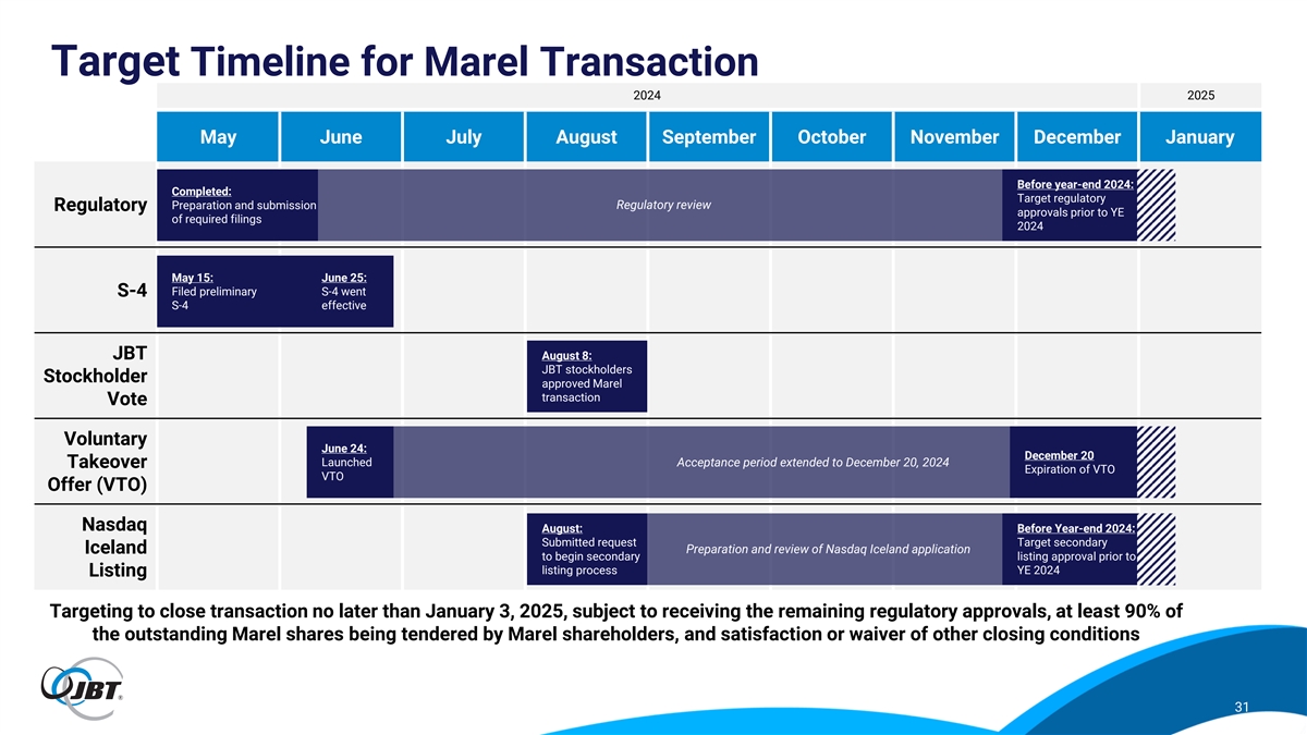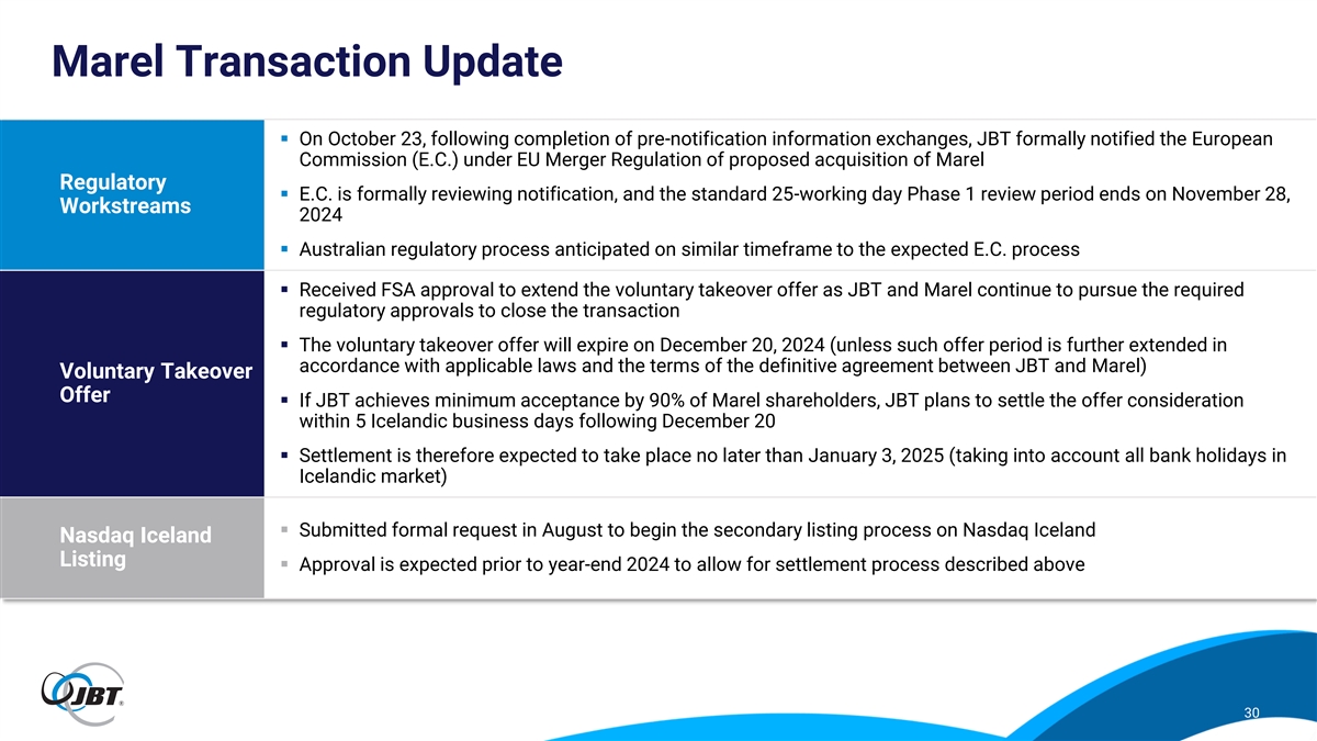 Marel Transaction Update ▪ On October 23, following completion of pre-notification information exchanges, JBT formally notified the European Commission (E.C.) under EU Merger Regulation of proposed acquisition of Marel Regulatory ▪ E.C. is formally reviewing notification, and the standard 25-working day Phase 1 review period ends on November 28, Workstreams 2024 ▪ Australian regulatory process anticipated on similar timeframe to the expected E.C. process ▪ Received FSA approval to extend the voluntary takeover offer as JBT and Marel continue to pursue the required regulatory approvals to close the transaction ▪ The voluntary takeover offer will expire on December 20, 2024 (unless such offer period is further extended in accordance with applicable laws and the terms of the definitive agreement between JBT and Marel) Voluntary Takeover Offer ▪ If JBT achieves minimum acceptance by 90% of Marel shareholders, JBT plans to settle the offer consideration within 5 Icelandic business days following December 20 ▪ Settlement is therefore expected to take place no later than January 3, 2025 (taking into account all bank holidays in Icelandic market) ▪ Submitted formal request in August to begin the secondary listing process on Nasdaq Iceland Nasdaq Iceland Listing ▪ Approval is expected prior to year-end 2024 to allow for settlement process described above 30
