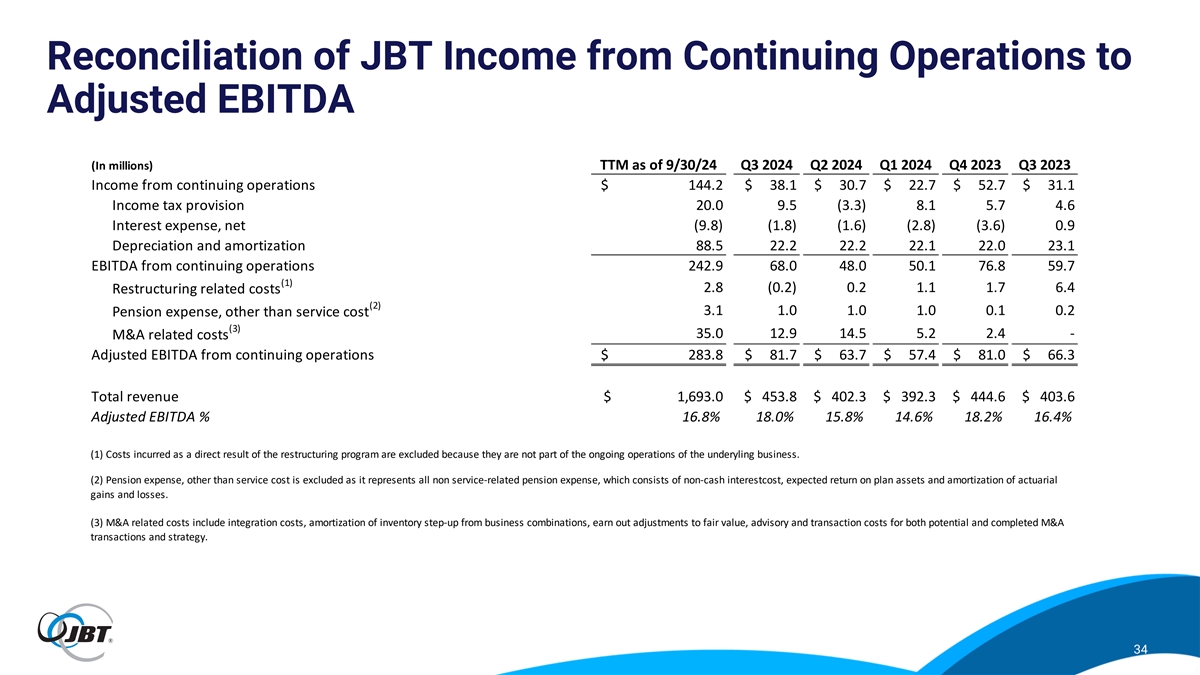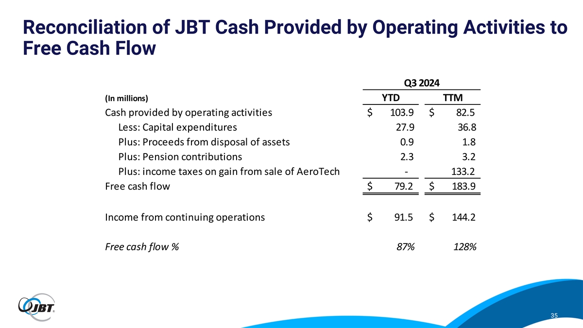 Reconciliation of JBT Cash Provided by Operating Activities to Free Cash Flow Q3 2024 (In millions) YTD TTM Cash provided by operating activities $ 103.9 $ 82.5 Less: Capital expenditures 27.9 36.8 Plus: Proceeds from disposal of assets 0.9 1.8 Plus: Pension contributions 2.3 3.2 Plus: income taxes on gain from sale of AeroTech - 133.2 Free cash flow $ 79.2 $ 183.9 Income from continuing operations $ 91.5 $ 144.2 Free cash flow % 87% 128% 35