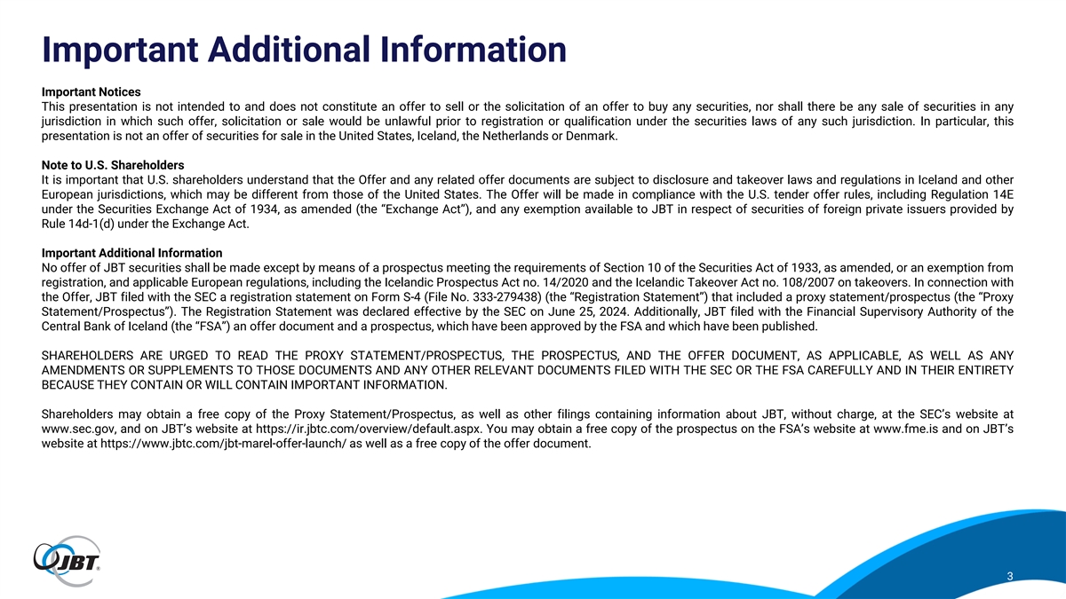Forward-Looking and Non-GAAP Statements This presentation contains forward-looking statements as defined in the Private Securities Litigation Reform Act of 1995. Forward-looking statements are information of a non-historical nature and are subject to risks and uncertainties that are beyond JBT’s ability to control. These forward-looking statements include, among others, statements relating to our business and our results of operations, a potential transaction with Marel, our strategic plans, our restructuring plans and expected cost savings from those plans, and our liquidity. The factors that could cause our actual results to differ materially from expectations include, but are not limited to, the following factors: the occurrence of any event, change or other circumstances that could give rise to the termination or abandonment of the voluntary takeover offer to acquire all issued and outstanding shares of Marel (the “Offer”); the expected timing and likelihood of completion of the proposed transaction with Marel, including the timing, receipt and terms and conditions of any required governmental and regulatory approvals for the Offer that could reduce anticipated benefits or cause the parties to abandon the transaction; the risk that Marel and/or JBT may not be able to satisfy the conditions to the Offer in a timely manner or at all; the risk that the Offer and its announcement could have an adverse effect on the ability of JBT and Marel to retain customers and retain and hire key personnel and maintain relationships with their suppliers and customers, and on their operating results and businesses generally; the risk that problems may arise in successfully integrating the businesses of Marel and JBT, which may result in the combined company not operating as effectively and efficiently as expected; the risk that the combined company may be unable to achieve cost-cutting synergies or that it may take longer than expected to achieve those synergies; fluctuations in our financial results; unanticipated delays or accelerations in our sales cycles; deterioration of economic conditions, including impacts from supply chain delays and reduced material or component availability; inflationary pressures, including increases in energy, raw material, freight and labor costs; disruptions in the political, regulatory, economic and social conditions of the countries in which we conduct business; changes to trade regulation, quotas, duties or tariffs; fluctuations in currency exchange rates; changes in food consumption patterns; impacts of pandemic illnesses, food borne illnesses and diseases to various agricultural products; weather conditions and natural disasters; the impact of climate change and environmental protection initiatives; acts of terrorism or war, including the ongoing conflicts in Ukraine and the Middle East; termination or loss of major customer contracts and risks associated with fixed-price contracts, particularly during periods of high inflation; customer sourcing initiatives; competition and innovation in our industries; our ability to develop and introduce new or enhanced products and services and keep pace with technological developments; difficulty in developing, preserving and protecting our intellectual property or defending claims of infringement; catastrophic loss at any of our facilities and business continuity of our information systems; cyber-security risks such as network intrusion or ransomware schemes; loss of key management and other personnel; potential liability arising out of the installation or use of our systems; our ability to comply with U.S. and international laws governing our operations and industries; increases in tax liabilities; work stoppages; fluctuations in interest rates and returns on pension assets; a systemic failure of the banking system in the United States or globally impacting our customers’ financial condition and their demand for our goods and services; availability of and access to financial and other resources; the risk factors discussed in our proxy statement/prospectus filed pursuant to Rule 424(b) under the Securities Act of 1933, as amended (the “Securities Act”), on June 25, 2024 (the “Proxy Statement/Prospectus”), forming part of the Registration Statement on Form S-4 (File No. 333-279438) (the “Registration Statement”), initially filed by us on May 15, 2024 and declared effective on June 25, 2024; and other factors described under the captions “Risk Factors” and “Management’s Discussion and Analysis of Financial Condition and Results of Operations” in JBT’s most recent Annual Report on Form 10-K filed with the U.S. Securities and Exchange Commission (the “SEC”) and in any subsequently filed Quarterly Reports on Form 10-Q. JBT cautions shareholders and prospective investors that actual results may differ materially from those indicated by the forward-looking statements. JBT undertakes no obligation to publicly update or revise any forward-looking statements whether as a result of new information, future developments, subsequent events or changes in circumstances or otherwise. JBT provides non-GAAP financial measures in order to increase transparency in our operating results and trends. These non-GAAP measures eliminate certain costs or benefits from, or change the calculation of, a measure as calculated under U.S. GAAP. By eliminating these items, JBT provides a more meaningful comparison of our ongoing operating results, consistent with how management evaluates performance. Management uses these non-GAAP measures in financial and operational evaluation, planning and forecasting. These calculations may differ from similarly-titled measures used by other companies. The non-GAAP financial measures disclosed are not intended to be used as a substitute for, nor should they be considered in isolation of, financial measures prepared in accordance with U.S. GAAP. 2