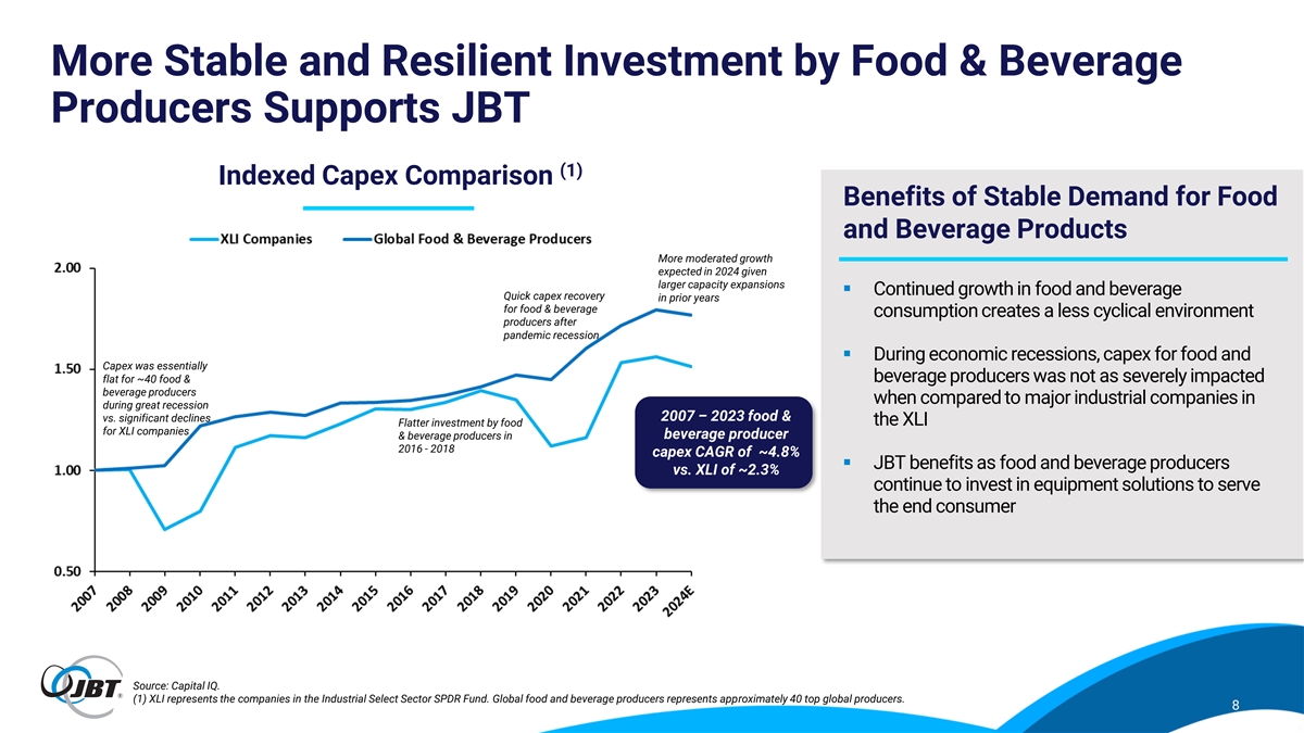 More Stable and Resilient Investment by Food & Beverage Producers Supports JBT (1) Indexed Capex Comparison Benefits of Stable Demand for Food and Beverage Products More moderated growth expected in 2024 given larger capacity expansions ▪ Continued growth in food and beverage Quick capex recovery in prior years for food & beverage consumption creates a less cyclical environment producers after pandemic recession ▪ During economic recessions, capex for food and Capex was essentially flat for ~40 food & beverage producers was not as severely impacted beverage producers when compared to major industrial companies in during great recession 2007 – 2023 food & vs. significant declines Flatter investment by food the XLI for XLI companies beverage producer & beverage producers in 2016 - 2018 capex CAGR of ~4.8% ▪ JBT benefits as food and beverage producers vs. XLI of ~2.3% continue to invest in equipment solutions to serve the end consumer Source: Capital IQ. (1) XLI represents the companies in the Industrial Select Sector SPDR Fund. Global food and beverage producers represents approximately 40 top global producers. 8