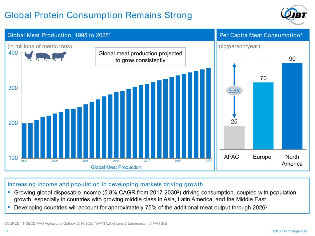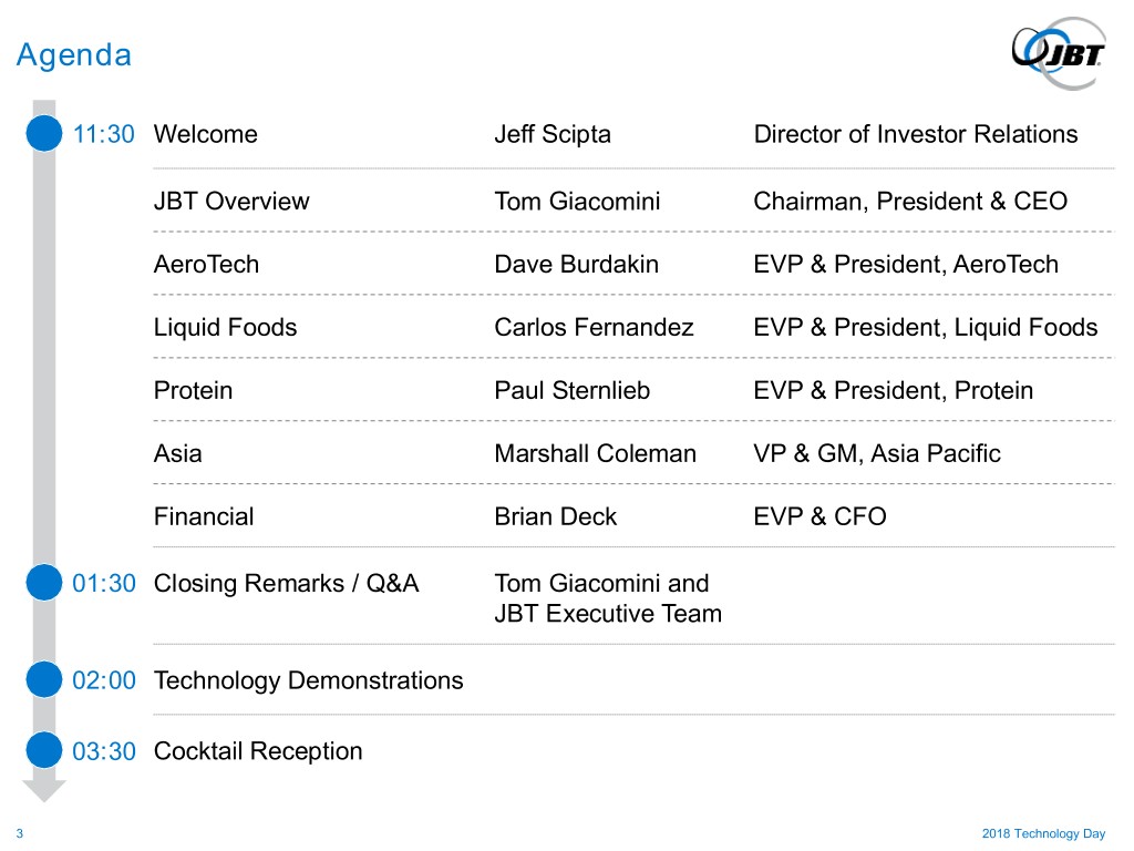 Forward-Looking Statements These slides and the accompanying presentation contain “forward-looking” statements, including statements about management’s expectations regarding trends in the food markets, strategic initiatives, acquisition strategies and long- term goals, which represent management’s best judgment as of the date hereof, based on currently available information. Actual results may differ materially from those contained in such forward-looking statements. JBT Corporation’s (the “Company”) most recent filings with the Securities and Exchange Commission include information concerning factors, including the factors set forth under “Item 1A. Risk Factors” in the Company’s Annual Report on Form 10-K filed with the Securities and Exchange Commission on February 28, 2018 that may cause actual results to differ from those anticipated by these forward-looking statements. The Company undertakes no obligation to update or revise these forward-looking statements to reflect new events or uncertainties. 2 2018 Technology Day
