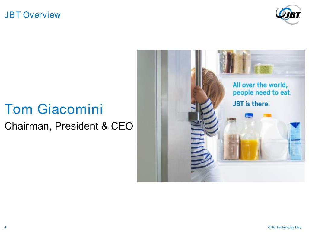 Agenda 11:30 Welcome Jeff Scipta Director of Investor Relations JBT Overview Tom Giacomini Chairman, President & CEO AeroTech Dave Burdakin EVP & President, AeroTech Liquid Foods Carlos Fernandez EVP & President, Liquid Foods Protein Paul Sternlieb EVP & President, Protein Asia Marshall Coleman VP & GM, Asia Pacific Financial Brian Deck EVP & CFO 01:30 Closing Remarks / Q&A Tom Giacomini and JBT Executive Team 02:00 Technology Demonstrations 03:30 Cocktail Reception 3 2018 Technology Day