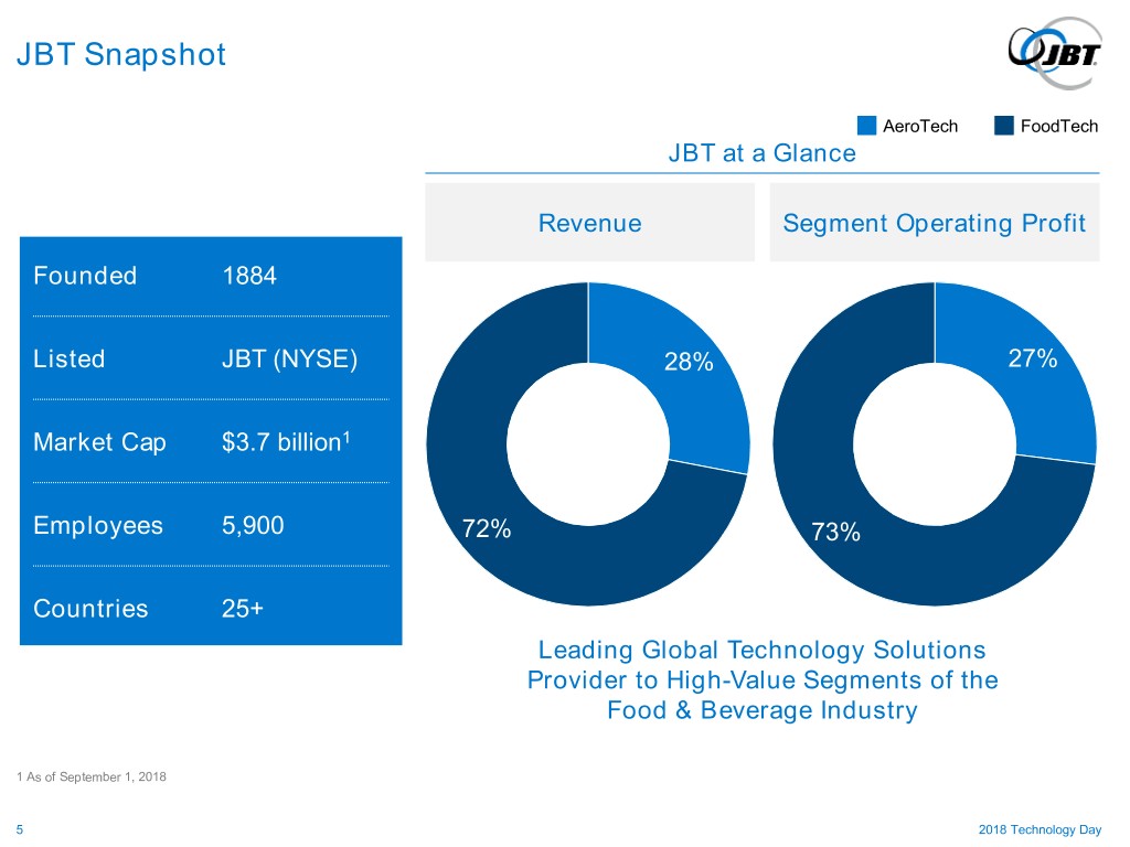 JBT Overview Tom Giacomini Chairman, President & CEO 4 2018 Technology Day