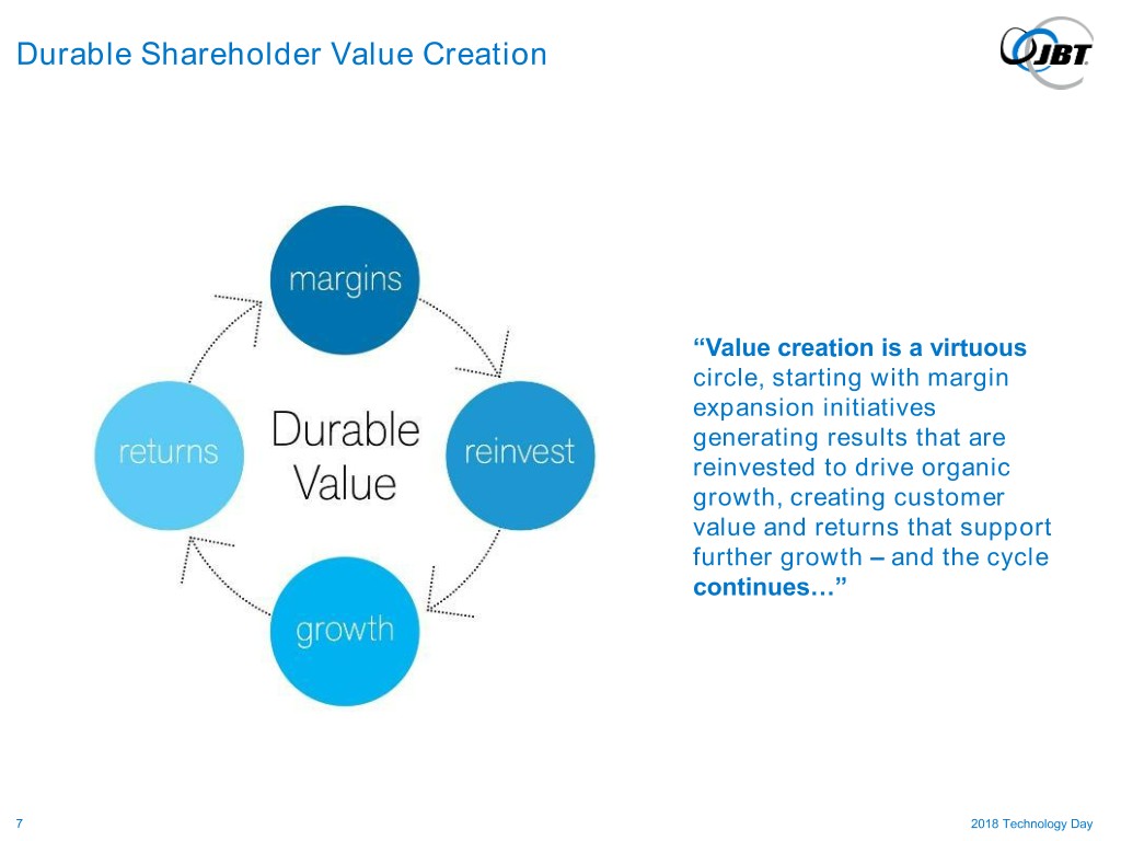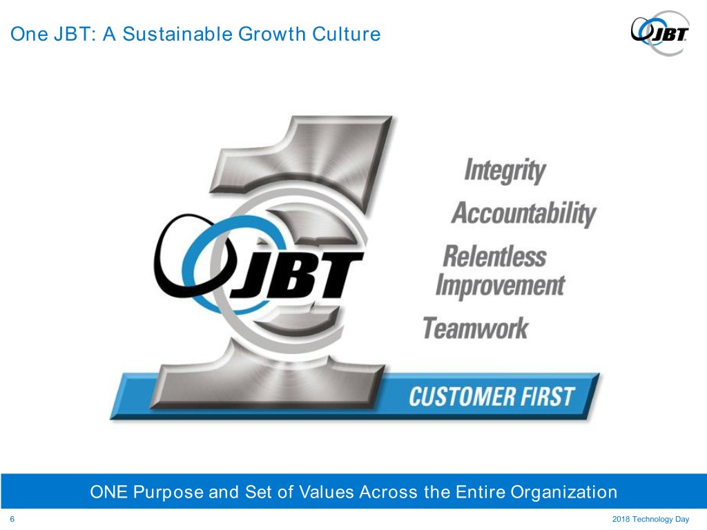 One JBT: A Sustainable Growth Culture ONE Purpose and Set of Values Across the Entire Organization 6 2018 Technology Day