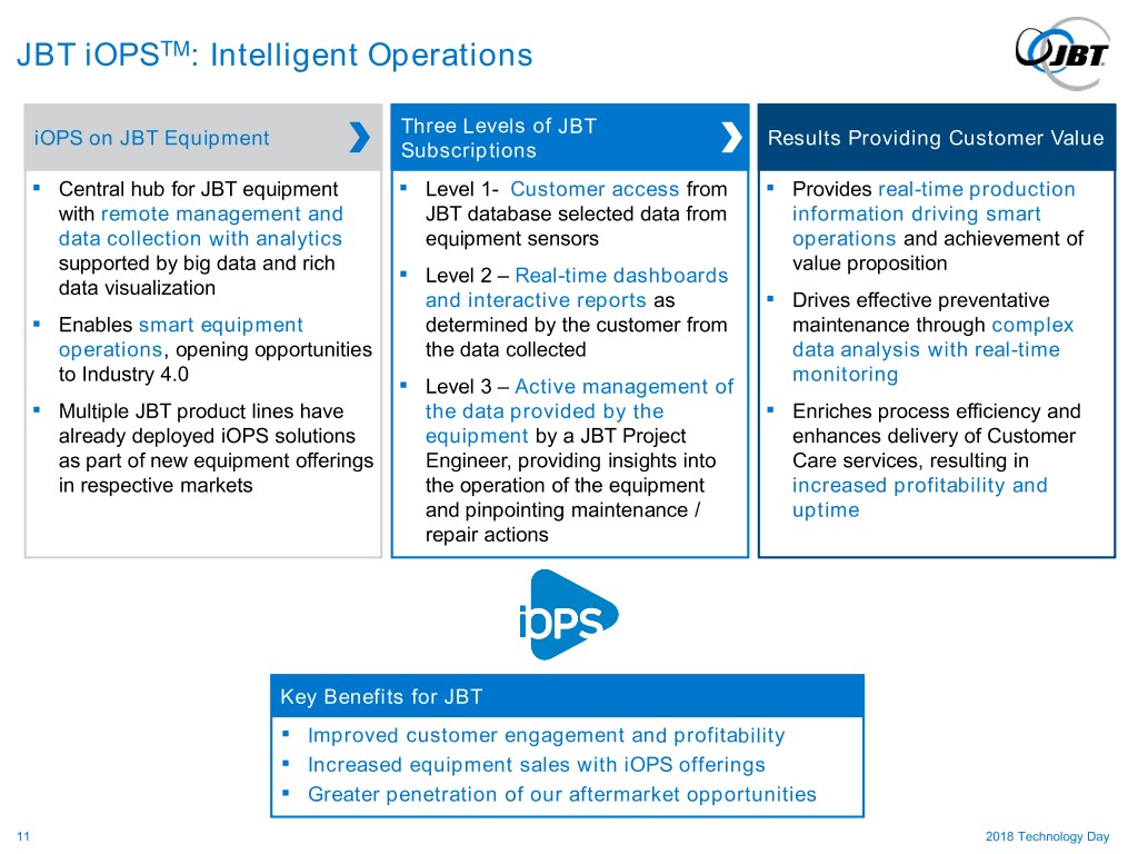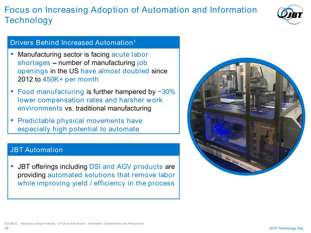 Focus on Increasing Adoption of Automation and Information Technology Drivers Behind Increased Automation1 ▪ Manufacturing sector is facing acute labor shortages – number of manufacturing job openings in the US have almost doubled since 2012 to 450K+ per month ▪ Food manufacturing is further hampered by ~30% lower compensation rates and harsher work environments vs. traditional manufacturing ▪ Predictable physical movements have especially high potential to automate JBT Automation ▪ JBT offerings including DSI and AGV products are providing automated solutions that remove labor while improving yield / efficiency in the process SOURCE: 1 McKinsey Global Institute, “A Future that Works: Automation, Employment and Productivity” 10 2018 Technology Day