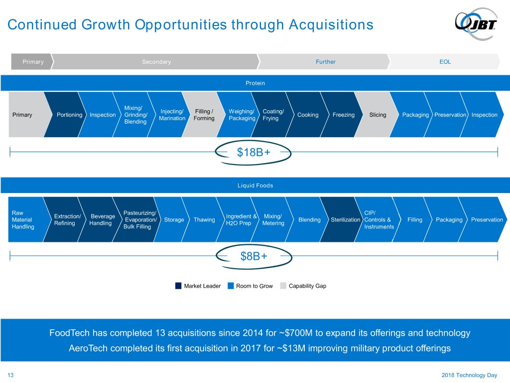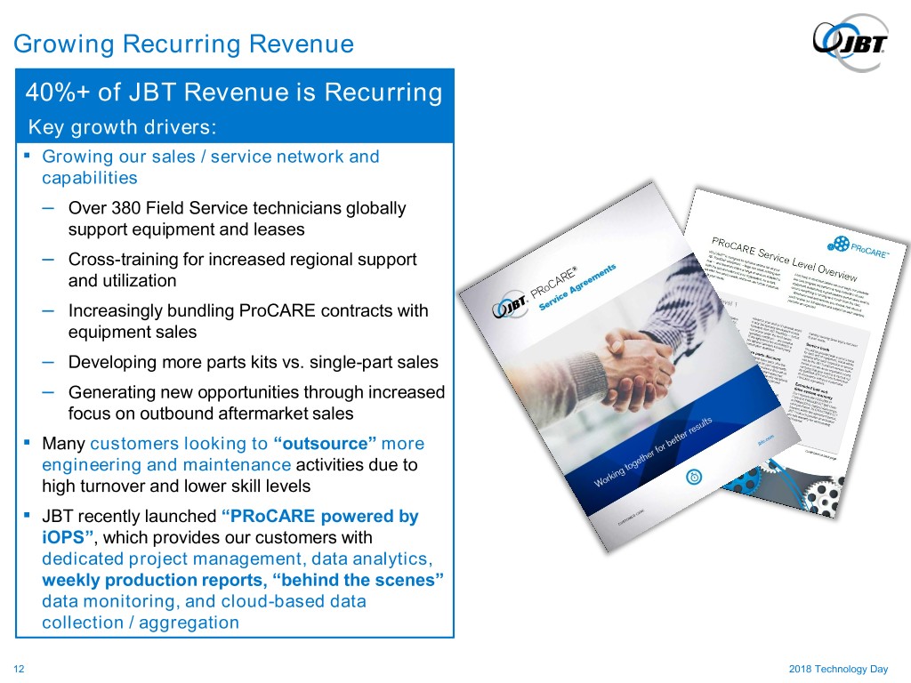 Growing Recurring Revenue 40%+ of JBT Revenue is Recurring Key growth drivers: ▪ Growing our sales / service network and capabilities – Over 380 Field Service technicians globally support equipment and leases – Cross-training for increased regional support and utilization – Increasingly bundling ProCARE contracts with equipment sales – Developing more parts kits vs. single-part sales – Generating new opportunities through increased focus on outbound aftermarket sales ▪ Many customers looking to “outsource” more engineering and maintenance activities due to high turnover and lower skill levels ▪ JBT recently launched “PRoCARE powered by iOPS”, which provides our customers with dedicated project management, data analytics, weekly production reports, “behind the scenes” data monitoring, and cloud-based data collection / aggregation 12 2018 Technology Day