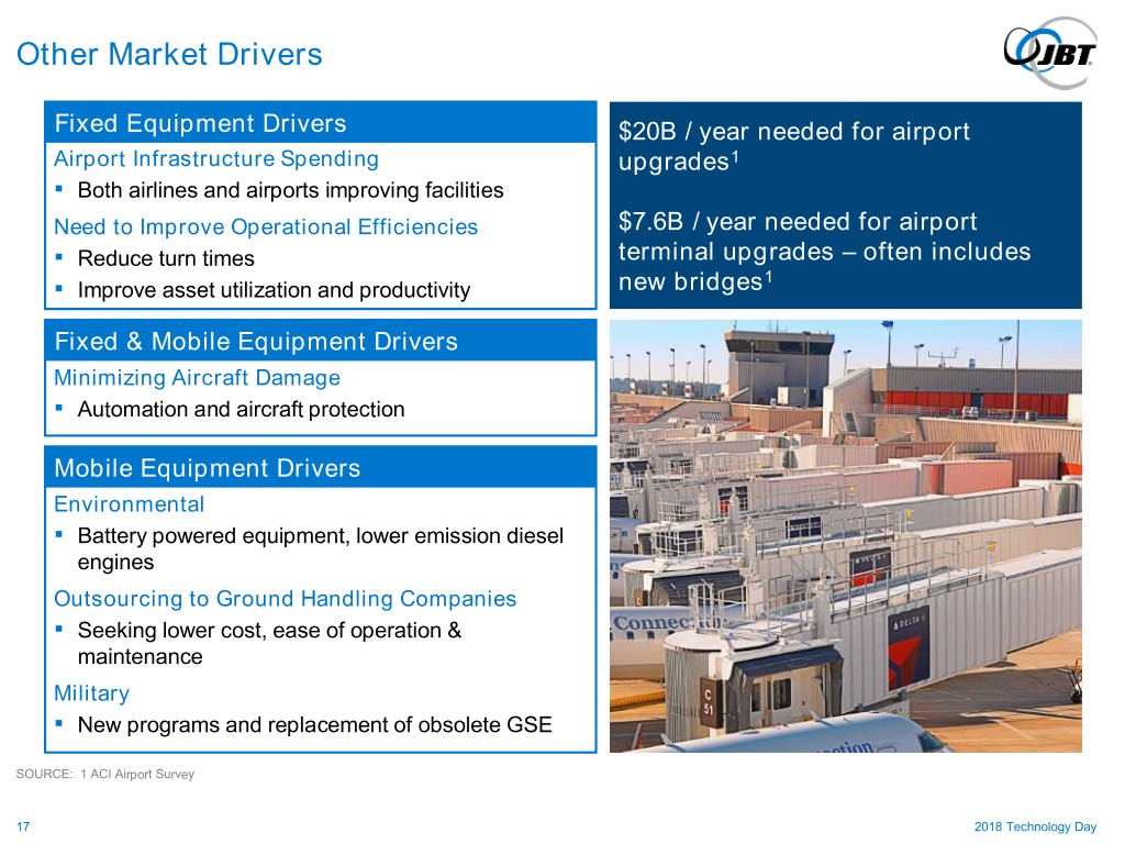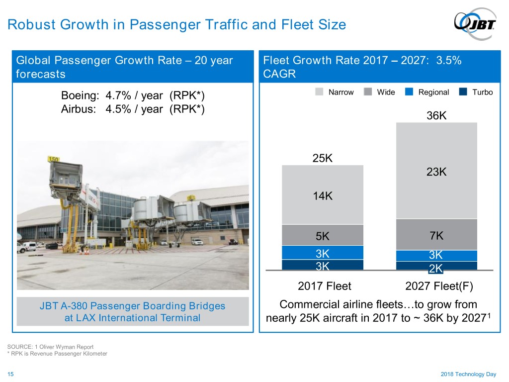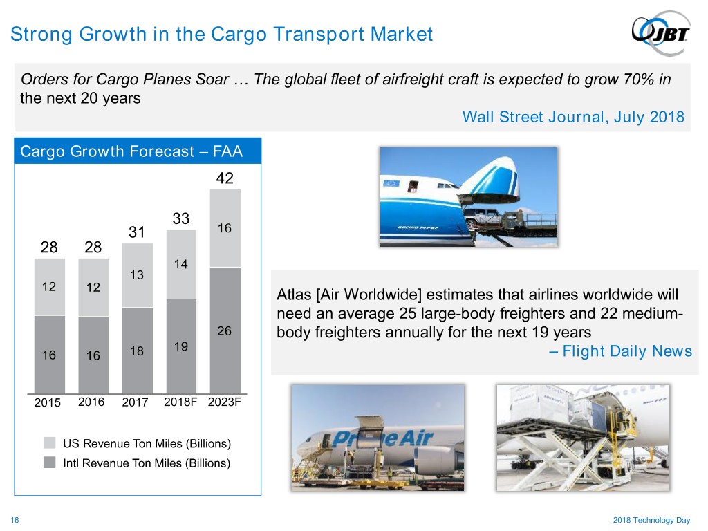 Robust Growth in Passenger Traffic and Fleet Size Global Passenger Growth Rate – 20 year Fleet Growth Rate 2017 – 2027: 3.5% forecasts CAGR Boeing: 4.7% / year (RPK*) Narrow Wide Regional Turbo Airbus: 4.5% / year (RPK*) 36K 25K 23K 14K 5K 7K 3K 3K 3K 2K 2017 Fleet 2027 Fleet(F) JBT A-380 Passenger Boarding Bridges Commercial airline fleets…to grow from at LAX International Terminal nearly 25K aircraft in 2017 to ~ 36K by 20271 SOURCE: 1 Oliver Wyman Report * RPK is Revenue Passenger Kilometer 15 2018 Technology Day