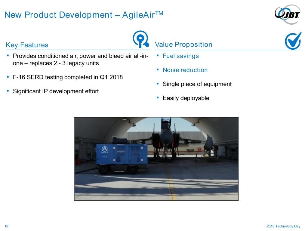 New Product Development – AgileAirTM Key Features Value Proposition ▪ Provides conditioned air, power and bleed air all-in- ▪ Fuel savings one – replaces 2 - 3 legacy units ▪ Noise reduction ▪ F-16 SERD testing completed in Q1 2018 ▪ Single piece of equipment ▪ Significant IP development effort ▪ Easily deployable 18 2018 Technology Day