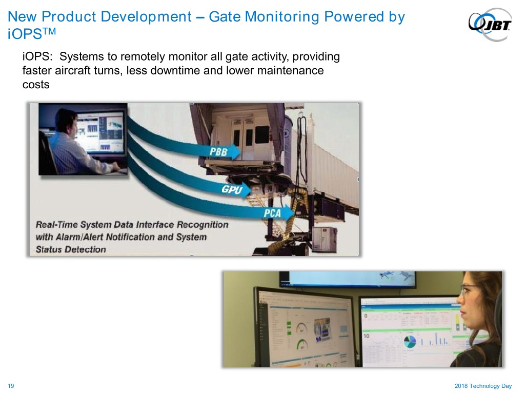 New Product Development – Gate Monitoring Powered by iOPSTM iOPS: Systems to remotely monitor all gate activity, providing faster aircraft turns, less downtime and lower maintenance costs 19 2018 Technology Day
