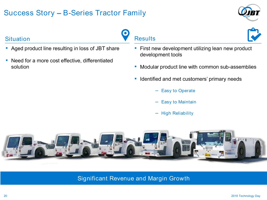 Success Story – B-Series Tractor Family Situation Results ▪ Aged product line resulting in loss of JBT share ▪ First new development utilizing lean new product development tools ▪ Need for a more cost effective, differentiated solution ▪ Modular product line with common sub-assemblies ▪ Identified and met customers’ primary needs – Easy to Operate – Easy to Maintain – High Reliability Significant Revenue and Margin Growth 20 2018 Technology Day