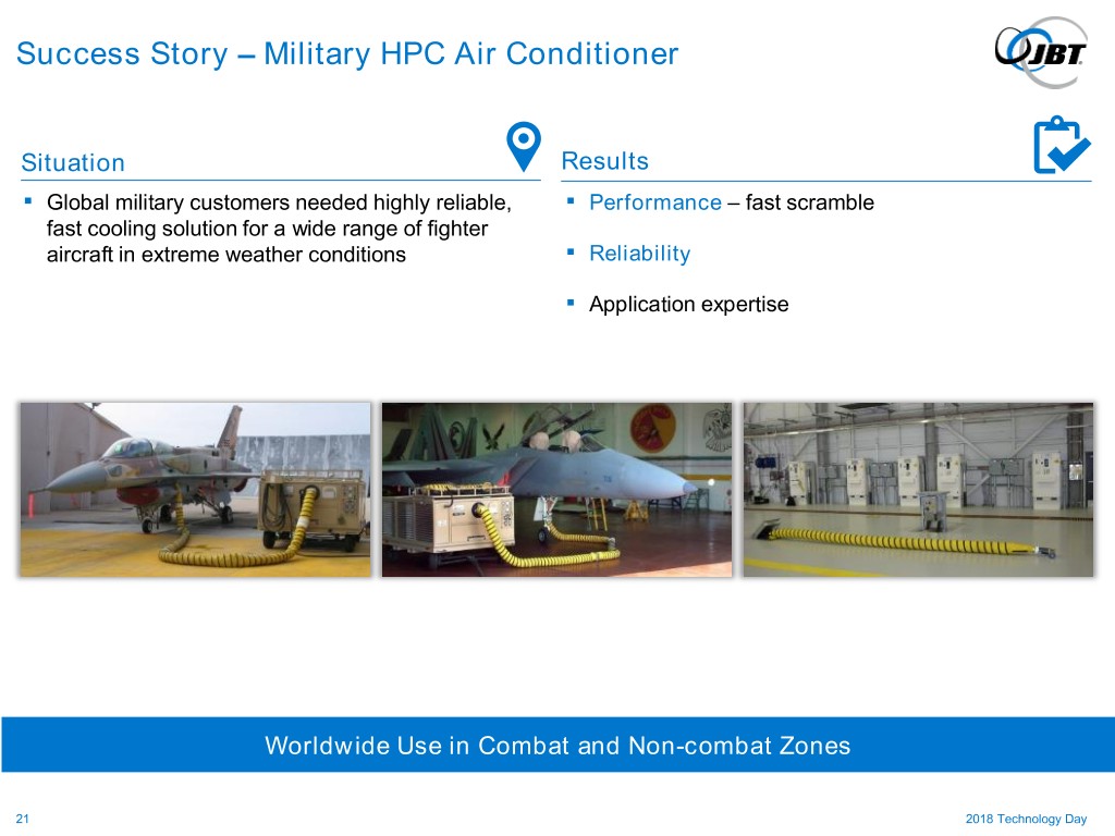 Success Story – Military HPC Air Conditioner Situation Results ▪ Global military customers needed highly reliable, ▪ Performance – fast scramble fast cooling solution for a wide range of fighter aircraft in extreme weather conditions ▪ Reliability ▪ Application expertise Worldwide Use in Combat and Non-combat Zones 21 2018 Technology Day