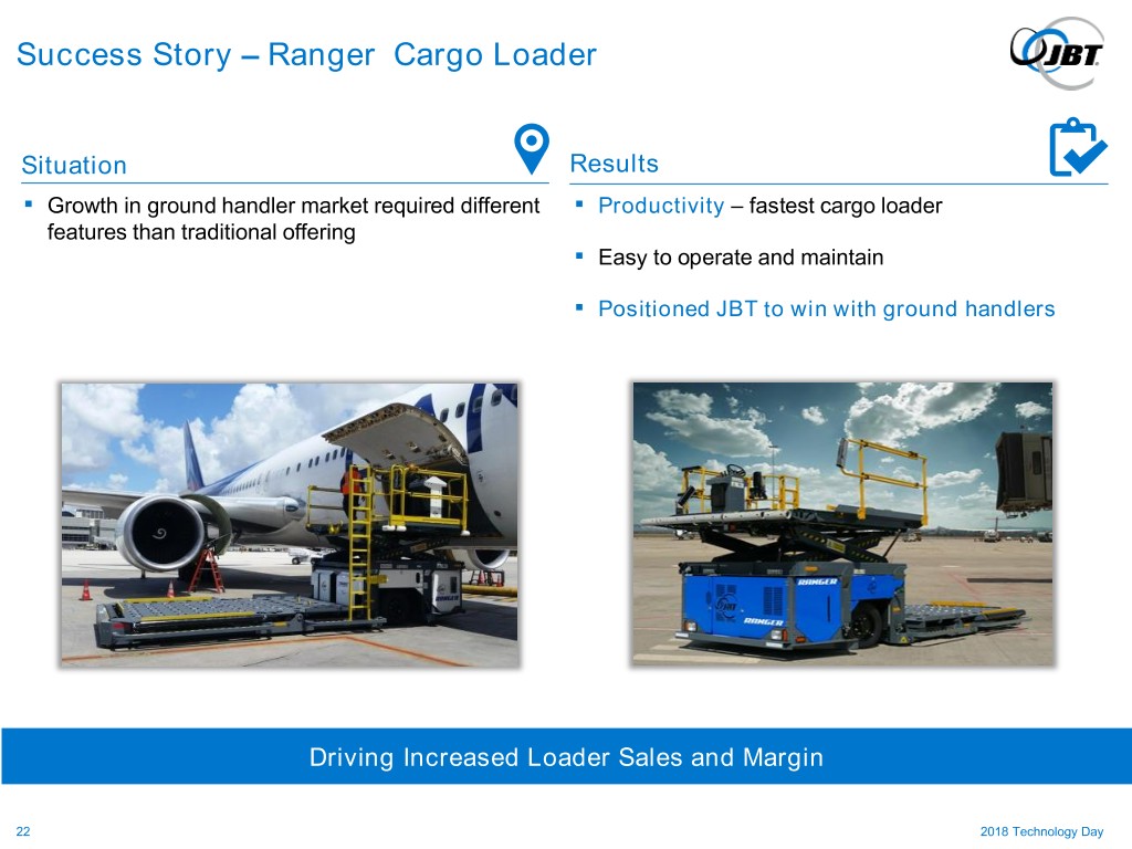 Success Story – Ranger Cargo Loader Situation Results ▪ Growth in ground handler market required different ▪ Productivity – fastest cargo loader features than traditional offering ▪ Easy to operate and maintain ▪ Positioned JBT to win with ground handlers Driving Increased Loader Sales and Margin 22 2018 Technology Day