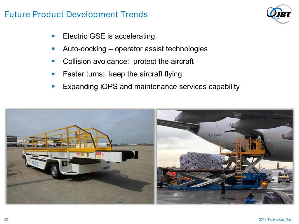 Future Product Development Trends . Electric GSE is accelerating . Auto-docking – operator assist technologies . Collision avoidance: protect the aircraft . Faster turns: keep the aircraft flying . Expanding iOPS and maintenance services capability 23 2018 Technology Day