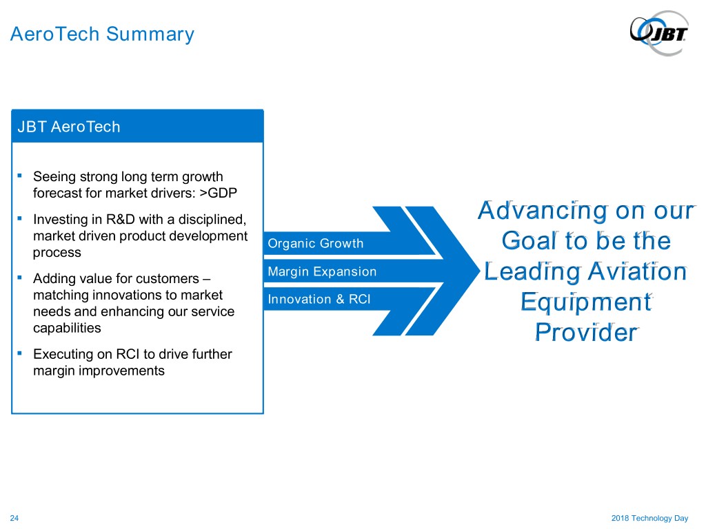 AeroTech Summary JBT AeroTech ▪ Seeing strong long term growth forecast for market drivers: >GDP ▪ Investing in R&D with a disciplined, Advancing on our market driven product development Organic Growth process Goal to be the Margin Expansion ▪ Adding value for customers – Leading Aviation matching innovations to market Innovation & RCI needs and enhancing our service Equipment capabilities Provider ▪ Executing on RCI to drive further margin improvements 24 2018 Technology Day