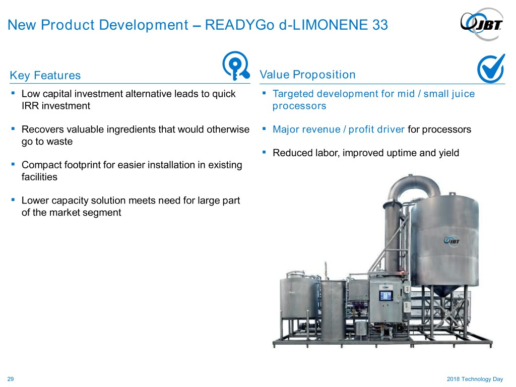 New Product Development – READYGo d-LIMONENE 33 Key Features Value Proposition ▪ Low capital investment alternative leads to quick ▪ Targeted development for mid / small juice IRR investment processors ▪ Recovers valuable ingredients that would otherwise ▪ Major revenue / profit driver for processors go to waste ▪ Reduced labor, improved uptime and yield ▪ Compact footprint for easier installation in existing facilities ▪ Lower capacity solution meets need for large part of the market segment 29 2018 Technology Day