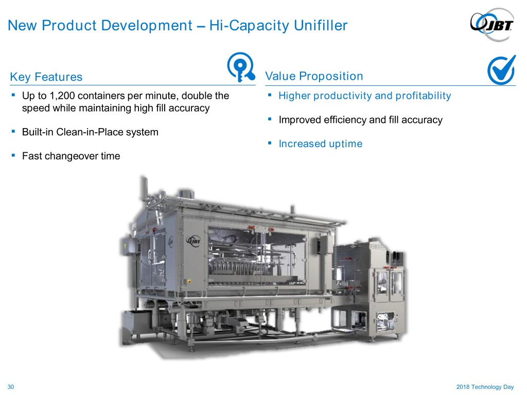 New Product Development – Hi-Capacity Unifiller Key Features Value Proposition ▪ Up to 1,200 containers per minute, double the ▪ Higher productivity and profitability speed while maintaining high fill accuracy ▪ Improved efficiency and fill accuracy ▪ Built-in Clean-in-Place system ▪ Increased uptime ▪ Fast changeover time 30 2018 Technology Day