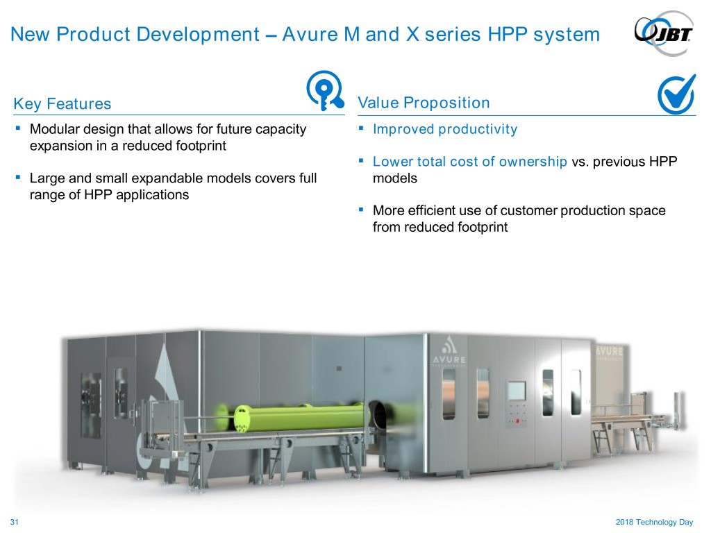 New Product Development – Avure M and X series HPP system Key Features Value Proposition ▪ Modular design that allows for future capacity ▪ Improved productivity expansion in a reduced footprint ▪ Lower total cost of ownership vs. previous HPP ▪ Large and small expandable models covers full models range of HPP applications ▪ More efficient use of customer production space from reduced footprint 31 2018 Technology Day