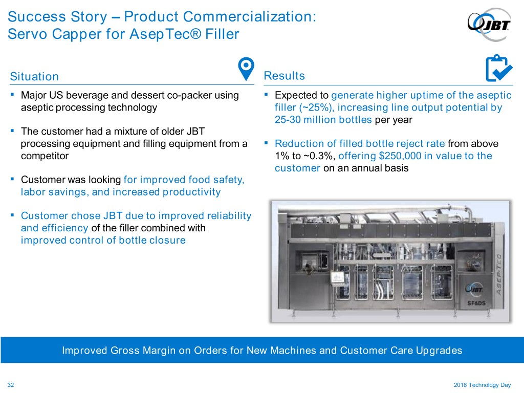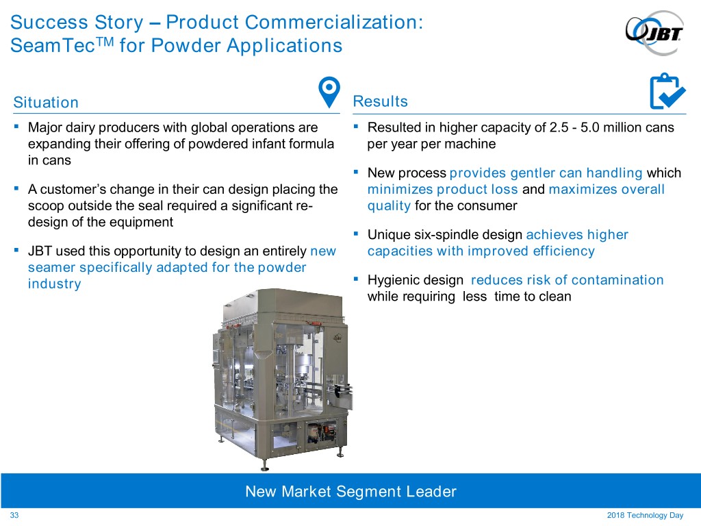 Success Story – Product Commercialization: Servo Capper for AsepTec® Filler Situation Results ▪ Major US beverage and dessert co-packer using ▪ Expected to generate higher uptime of the aseptic aseptic processing technology filler (~25%), increasing line output potential by 25-30 million bottles per year ▪ The customer had a mixture of older JBT processing equipment and filling equipment from a ▪ Reduction of filled bottle reject rate from above competitor 1% to ~0.3%, offering $250,000 in value to the customer on an annual basis ▪ Customer was looking for improved food safety, labor savings, and increased productivity ▪ Customer chose JBT due to improved reliability and efficiency of the filler combined with improved control of bottle closure Improved Gross Margin on Orders for New Machines and Customer Care Upgrades 32 2018 Technology Day