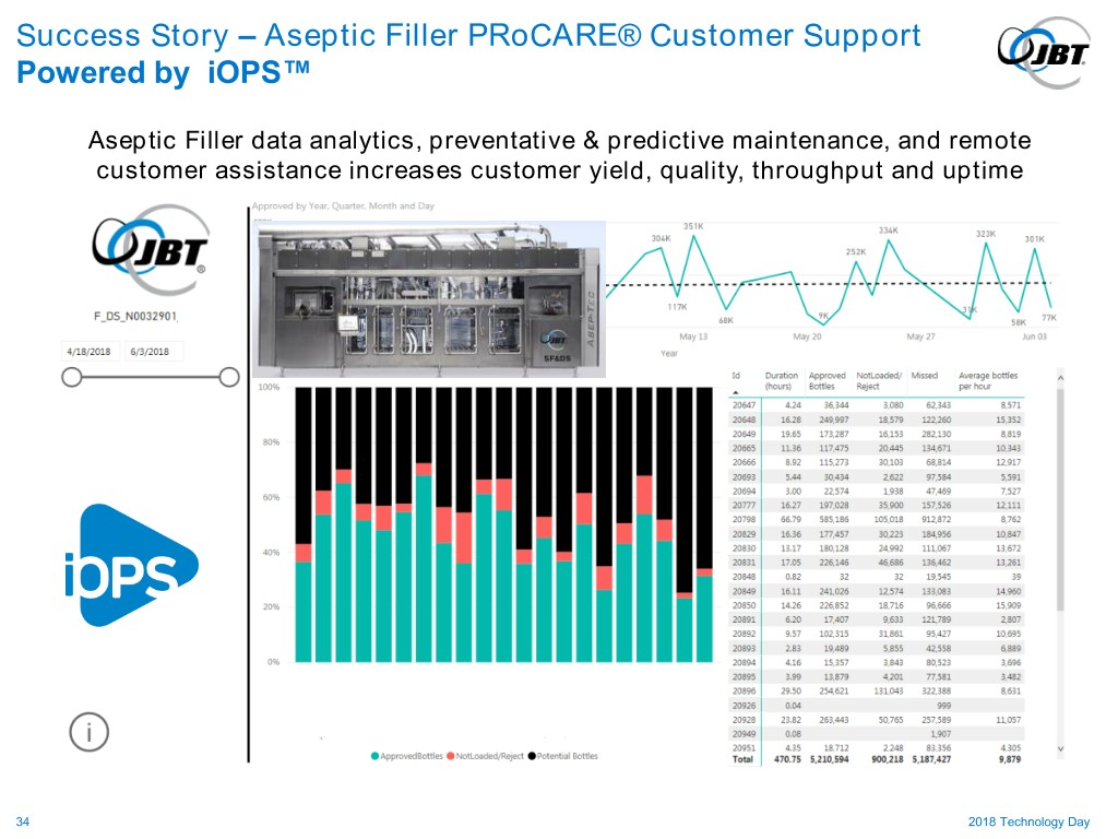 Success Story – Aseptic Filler PRoCARE® Customer Support Powered by iOPS™ Aseptic Filler data analytics, preventative & predictive maintenance, and remote customer assistance increases customer yield, quality, throughput and uptime 34 2018 Technology Day