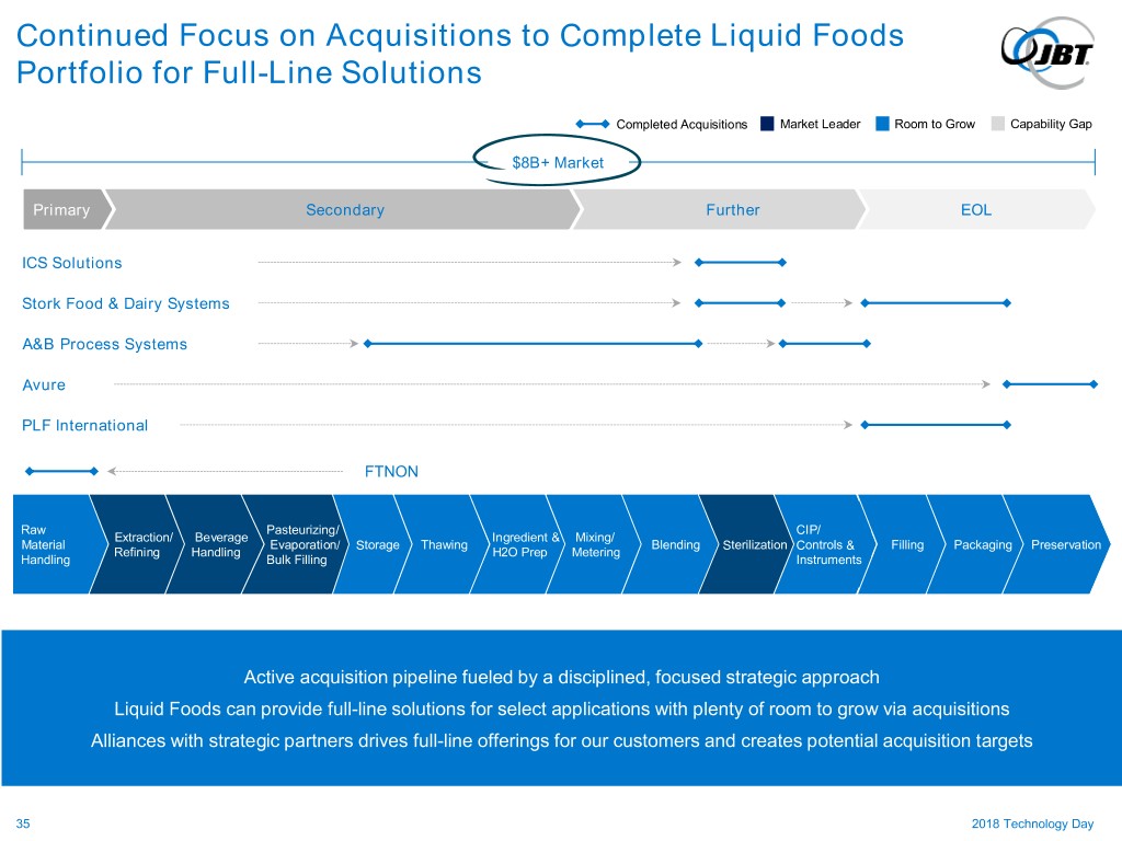 Continued Focus on Acquisitions to Complete Liquid Foods Portfolio for Full-Line Solutions Completed Acquisitions Market Leader Room to Grow Capability Gap $8B+ Market Primary Secondary Further EOL ICS Solutions Stork Food & Dairy Systems A&B Process Systems Avure PLF International FTNON Raw Pasteurizing/ CIP/ Extraction/ Beverage Ingredient & Mixing/ Material Evaporation/ Storage Thawing Blending Sterilization Controls & Filling Packaging Preservation Refining Handling H2O Prep Metering Handling Bulk Filling Instruments Active acquisition pipeline fueled by a disciplined, focused strategic approach Liquid Foods can provide full-line solutions for select applications with plenty of room to grow via acquisitions Alliances with strategic partners drives full-line offerings for our customers and creates potential acquisition targets 35 2018 Technology Day